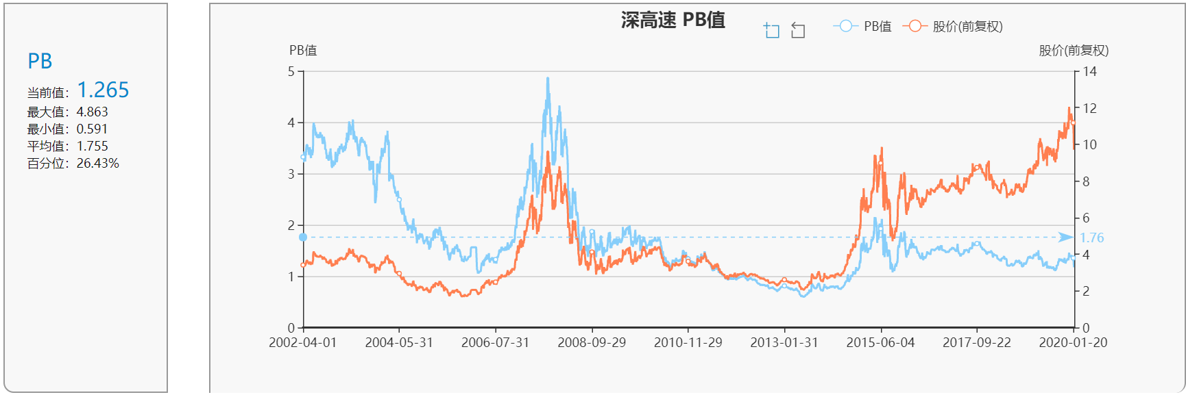 下图为深高速A的历史PE数据,当前的PE百分位极低。但是由于该公司的业绩波动较大,因此PE百分位的参考意义被削弱。下图为深高速A的历史PB数据,当前仅次于2014年熊市末期,属于很低的水平。PB的参考意义较大,但是如果没有H股作为参考,深高速也只算的上是“相对于历史上的自己是低估的”,并不能引起我的投资兴趣。