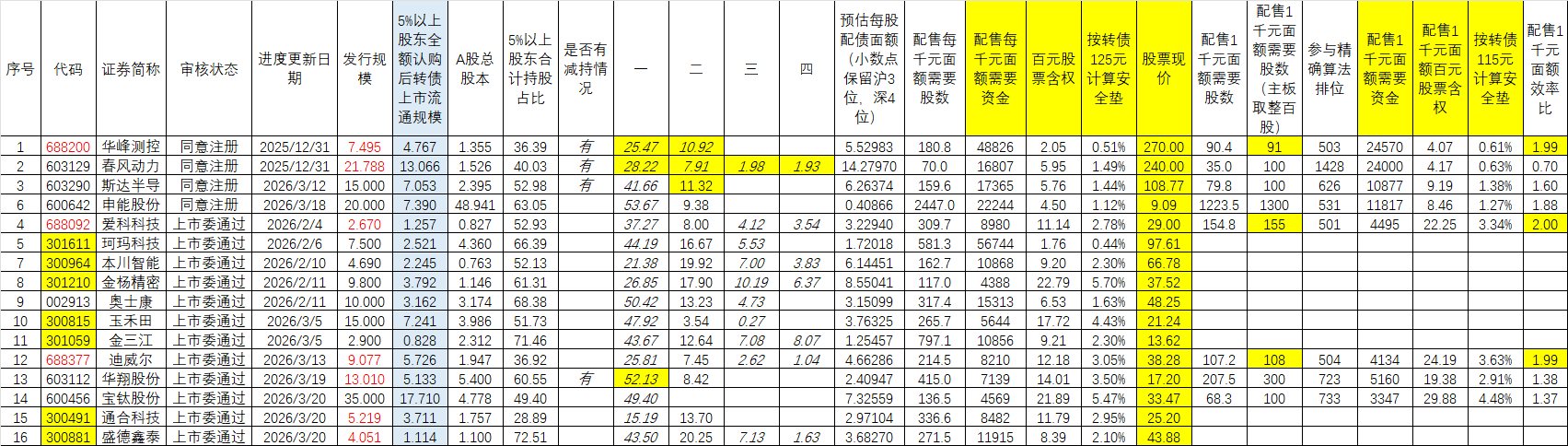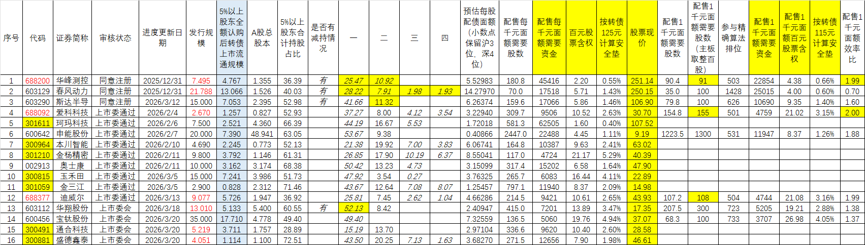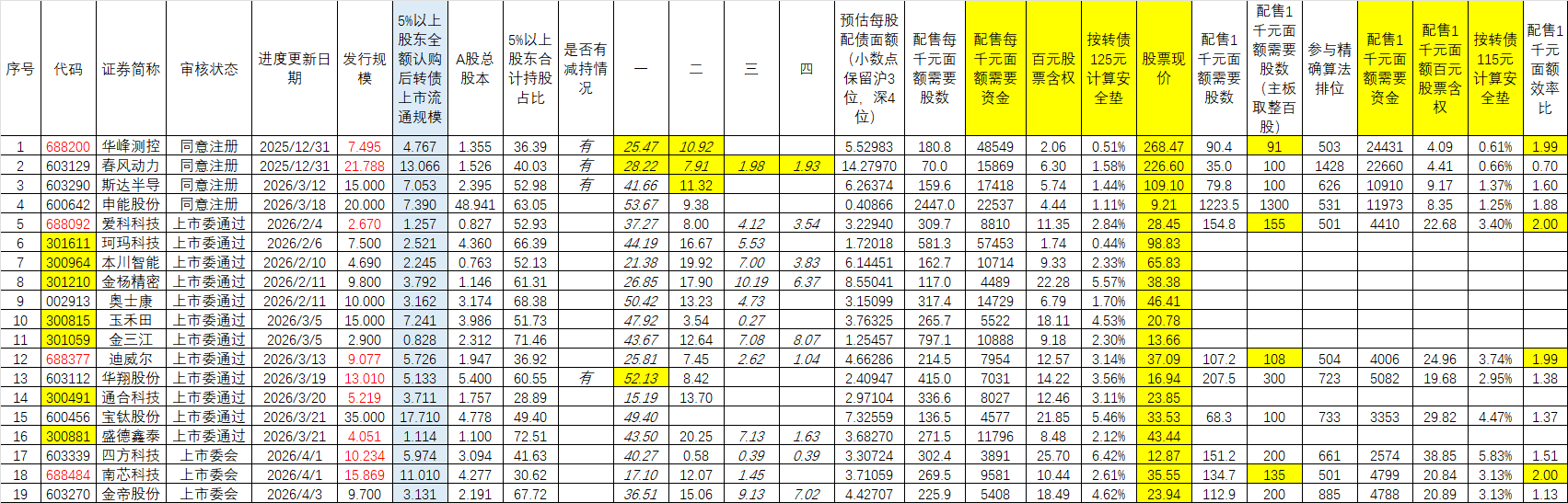 更新时间2025年12月31日。待发转债埋伏配债测算(更新至20251231) 图源:@知非丶一套不严谨的潜伏配债评分卡系统https://www.jisilu.cn/question/479915 可转债审核流程见:上交所发行上市审核http://www.sse.com.cn/listing/renewal/refinancing/深交所发行上市审核信息公开网站http://listin...龙大,近期根据您的表格实践待发转债埋伏配债,获得了一定的收益。感谢龙大辛辛苦苦的统计。请问龙大,这个表有更新版吗?