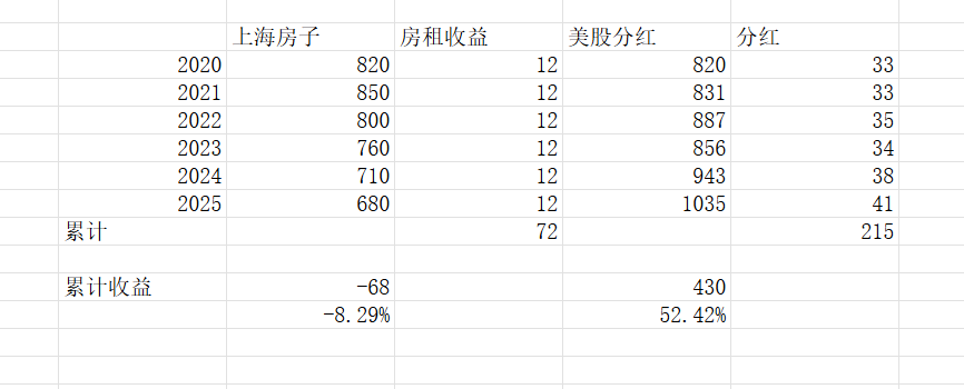 还有我另外一个帖子居然因为更新频率太低居然不让新加回复了,那就一起放这里更新算了 ,先贴一下之前5年数据的总结,总体思路就是比一下,以几十年大周期角度看,是上海房子养老实惠,还是美股分红养老好。起始资金是820个 rmb,考虑了汇率变化。 最后数据都是按人民币计算,当然房子我没有真的买,只是一直追踪。