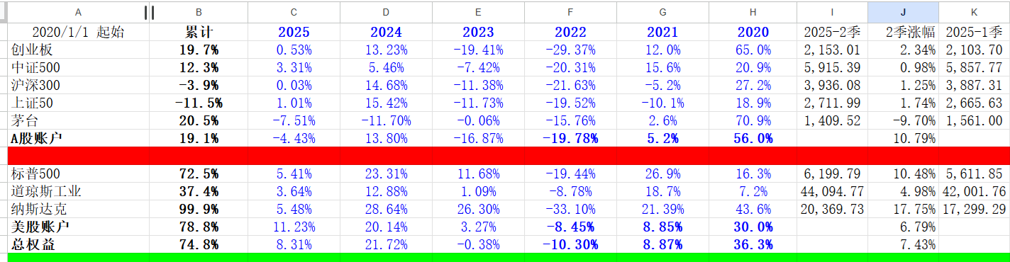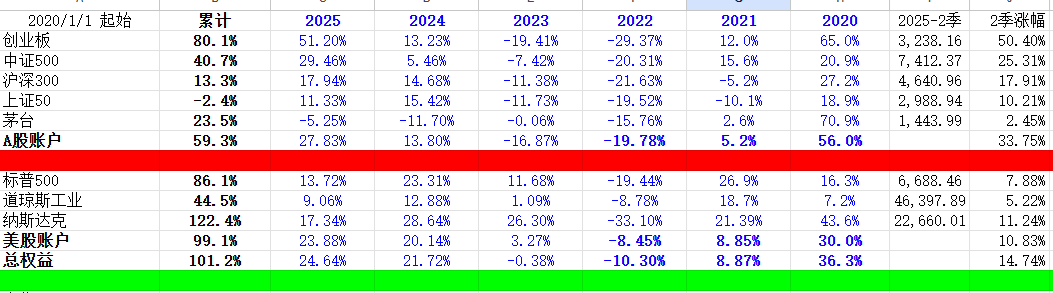 从2020年1月1日起, A股账户收益(含打新)89%,跑输创业板 。美股账户收益34%,跑输纳指,整体收益54%。 作为参考对象,这时间段,最牛表现神创,其次是纳指。 美股账户跑输主要原因是起步较晚,仓位不足。