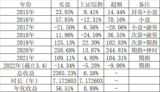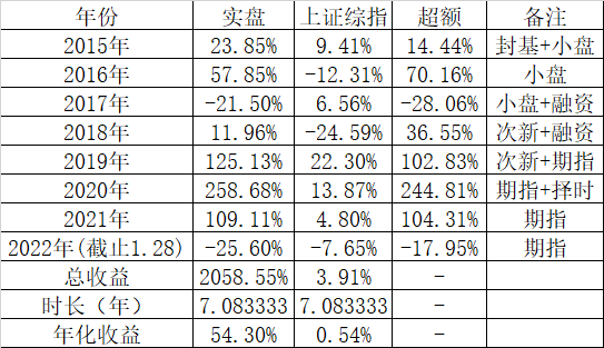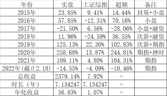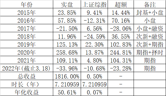 2014年中就开始炒股了,2015开始完整记录收益,现在这套系统投资的是宽基指数,真的能让人很安心,这根我早期投资小盘股,次新股,有很大的不同,这个不同点简单来说,就是没有锚。小盘股和次新股,如果轮动的不好,没有alpha的话会很让人焦虑,从而怀疑策略有效性,而吃贴水策略,可以用估值高低控制杠杆,这比小盘股和次新股多了一个历史的锚,而贴水的存在能保证永远有正的alpha,只是最近小了一些。所以说我...楼主境界让人肃然起敬,每次大跌前若满仓我都寝食难安。。。