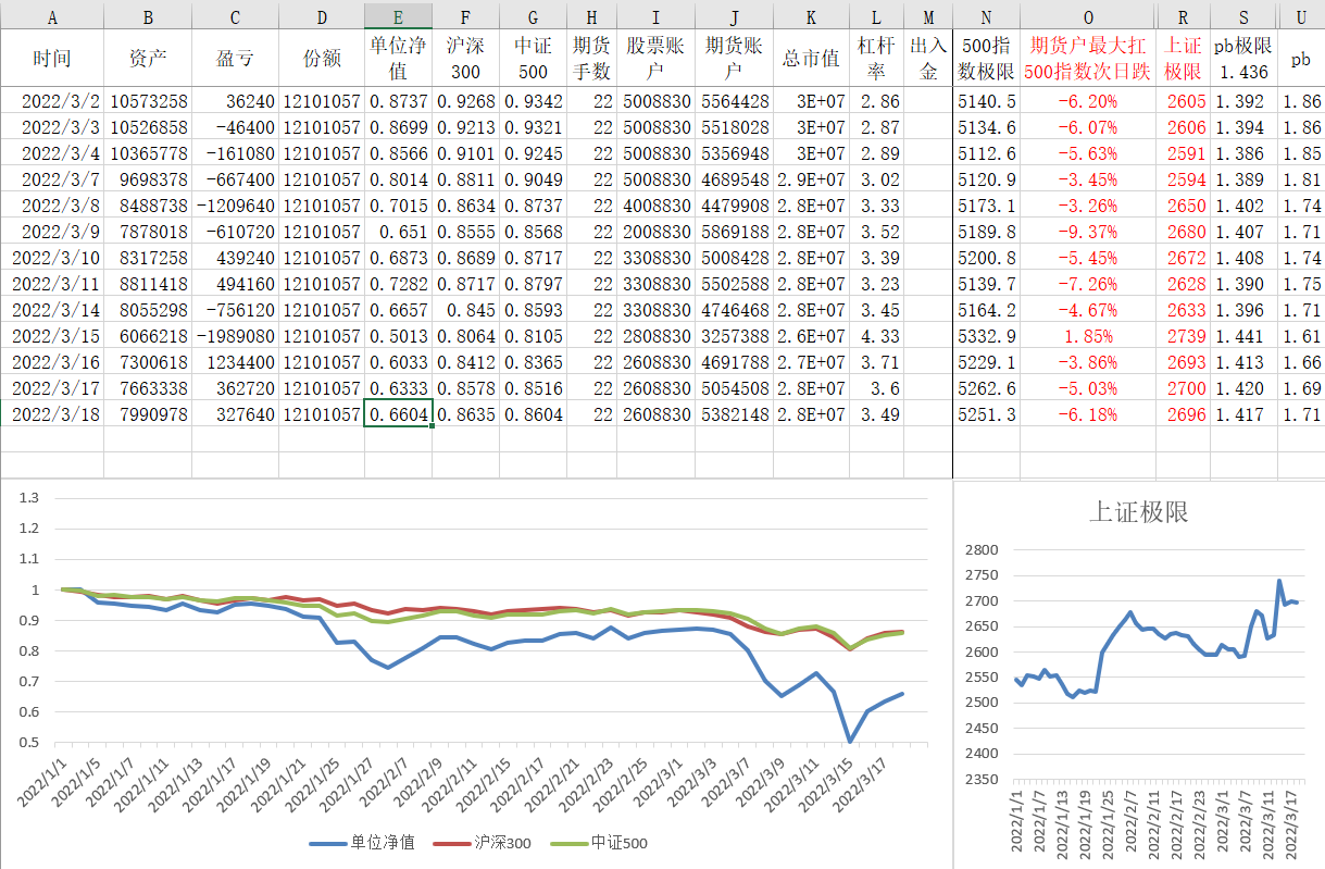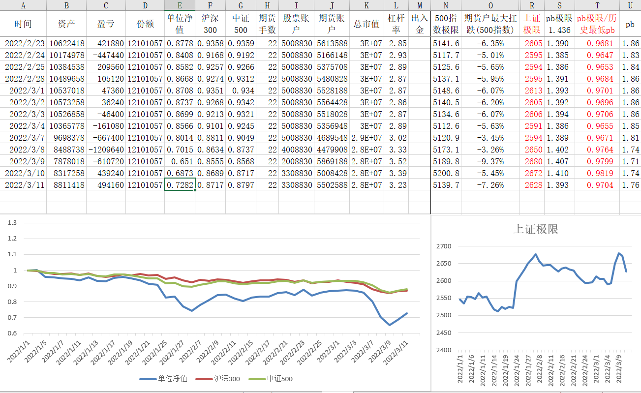 兄弟啊,有个问题,你做表格的时候中证500 是假设和上证指数跌幅一样的。但是这次的跌幅500超过上证大概30%。 上证-6.7% 中证500-9.8。 有没有方便的统计数据以往的历史跌幅。对比的数据分析?中证500的爆仓点,是算出来的,就是说跌到那个点位,期货账户会100%风险度,而上证综指的爆仓点位是与中证500同等跌幅情况下算出来的,这个当然参考意义不大,因为上证综指不可能跟中证500同跌同涨,算上证综指爆仓点位只有一个作用,就是给人一个直观的感受,毕竟没有几个人会关注中证500跌到5000意味着什么,但是上证综指跌到2600的话,任何股民都知道这意味着什么。其实最有用的是pb爆仓点位,我也一直是锚定pb爆仓点位控制仓位的