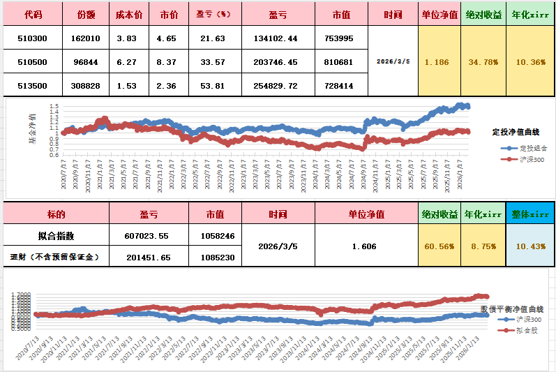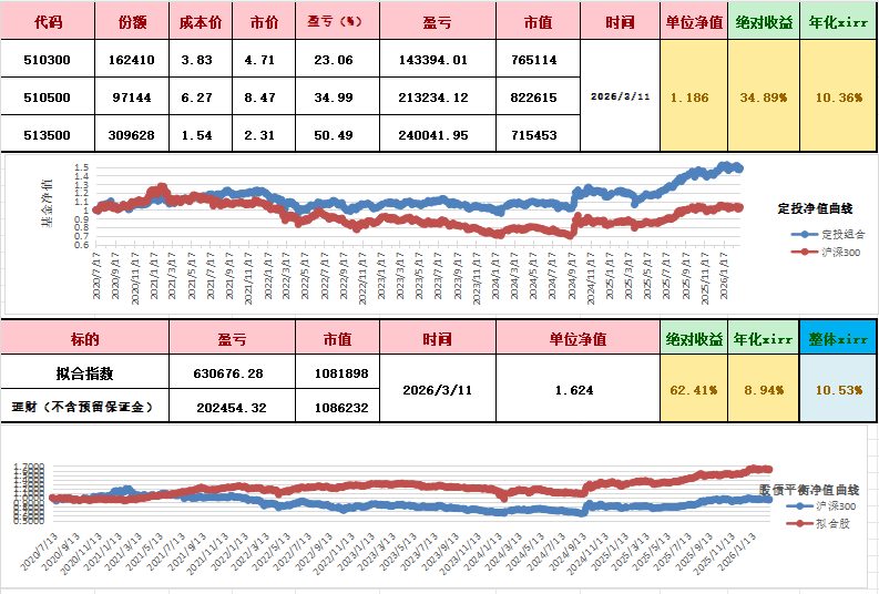 补充记录,2026年1月9日,盘中触及再平衡阈值,卖出市值大约113780的股,同时买入113780市值的债。这是第十二次再平衡操作。加上第一轮定投盈利,目前大约8.6年时间,xirr10.87%。