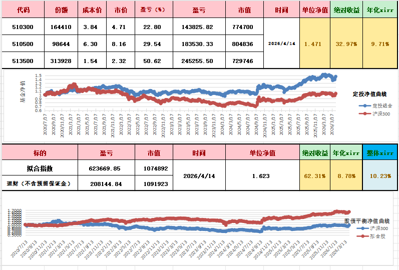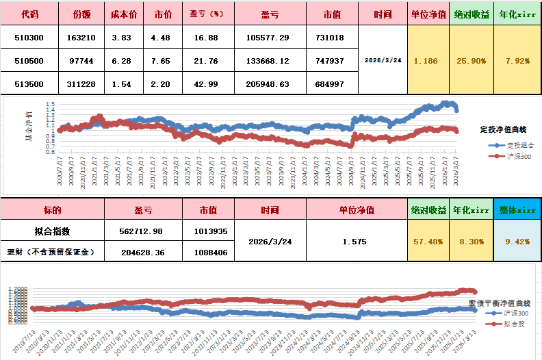 止盈资金132万,分配给股票大概68万,固收64万。我把300etf正股模拟持仓作为对比基准,两天前建仓的300etf,目前浮亏13580。