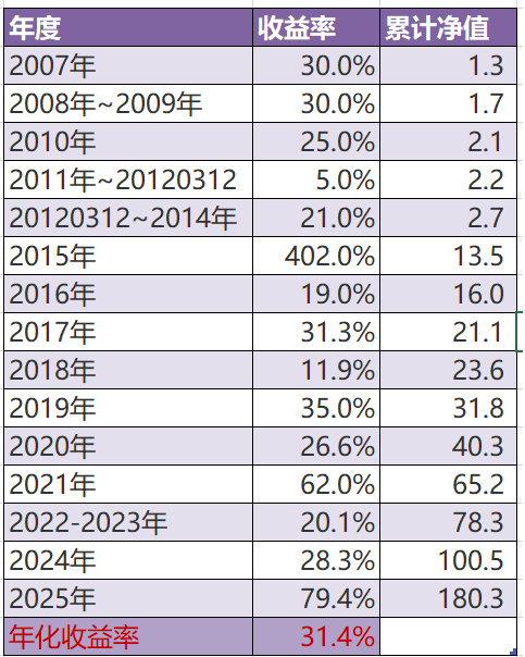 从楼主仓位和截图推算,楼主总资金量1000万~1800万,如果算收益率近20年赚了180倍,但就算起始资金5~10万元,作为一个80后中间不可能一分钱不入,起码得入100~200万。 那这样算收益率就不夸张了,可能就十几倍。你算的不错,