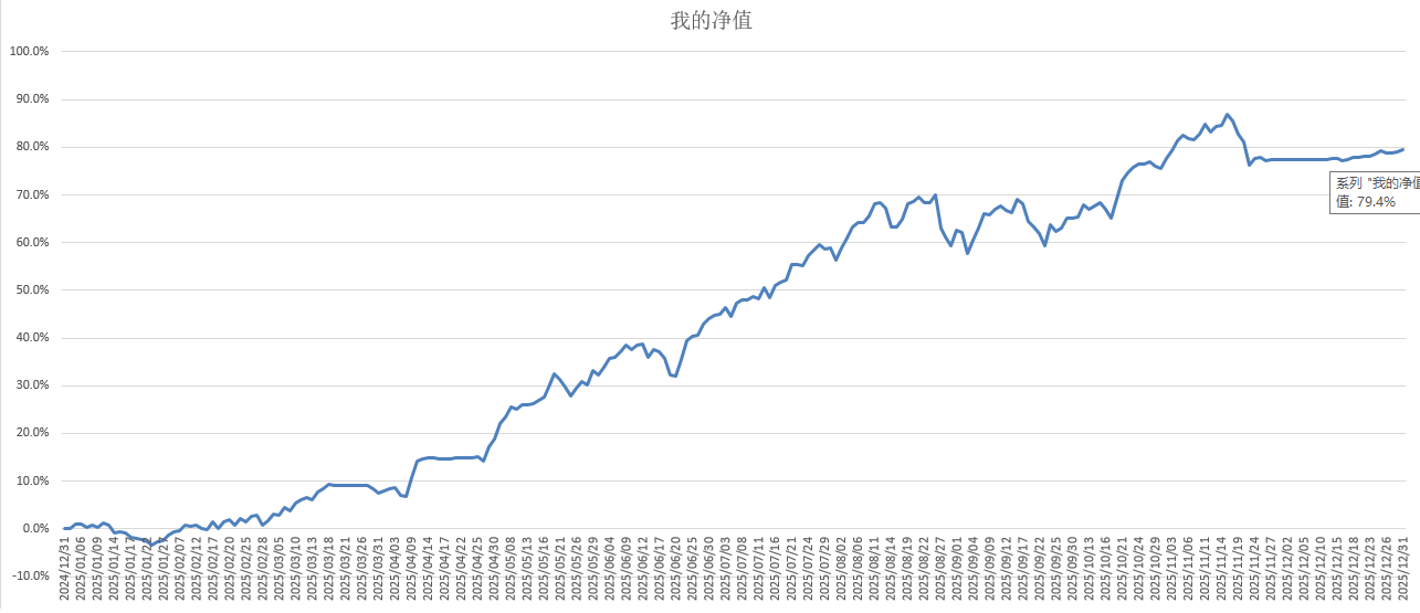2025年11月至2026年1月——20251023开始卖出,到做笔记的今天(20260109)依然没有买回!20251217最低点的时候,还在窃喜,心想,再跌10%就买回了岂不是很牛逼!当时是不可能买回的!结果错过了买点。卖出之后,每天都很茫然,不断的找机会想证明自己的择时正确,结果买国债期货大亏,买马字辈大亏,多IH空IM大亏!因为没有了信仰,又回到没有策略之前的状态!每天都很茫然!心情很沮丧,完全不如持有小市值的时候坚定!