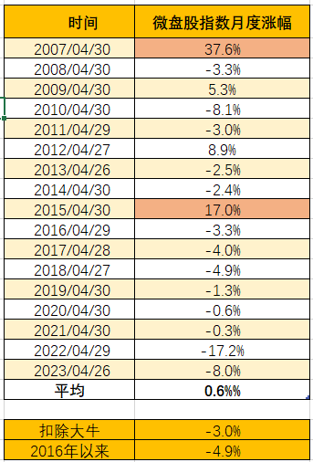 封基老师:微盘股指数4月份才跌了3.57%,去年跌了17.20%了。。。
