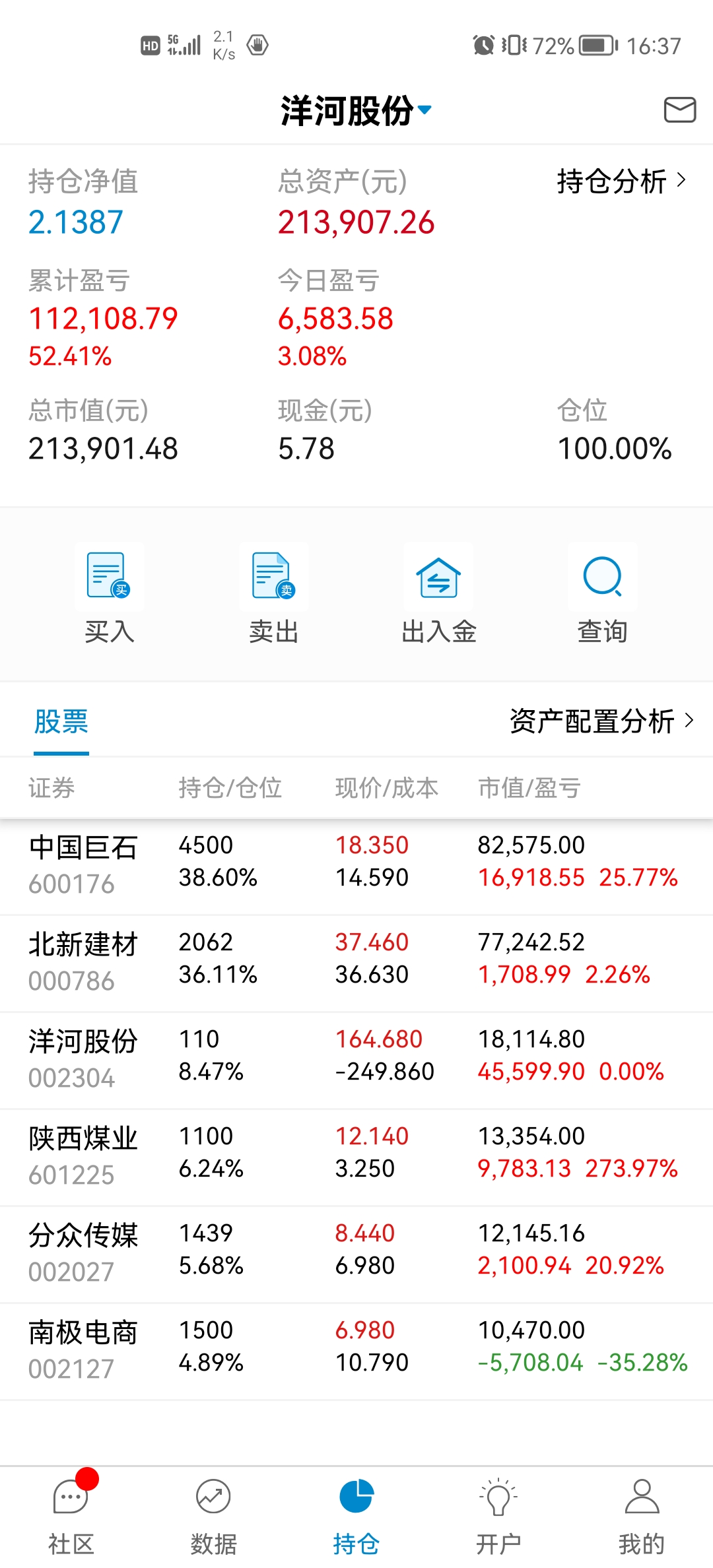 本周操作:30元挤点零花钱买入北新建材。