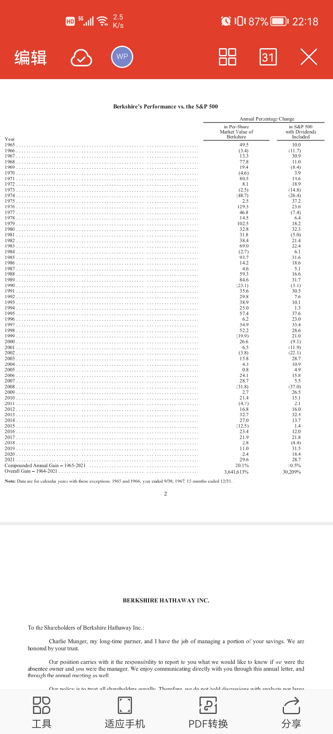本周继续率学习巴菲特致股东信,基本完结。用了三周学完巴菲特从1957年写到2020年一共60多年。整体感觉是这上百万文字充满智慧和处世之道。不仅仅是投资,还有巴菲特非凡的管理才能,伯克希尔总部二十几人管理者几十万人的庞大帝国。对属下不吝赞美之词,每次都是主动揽过,远宽近严,不断反思总结进化。