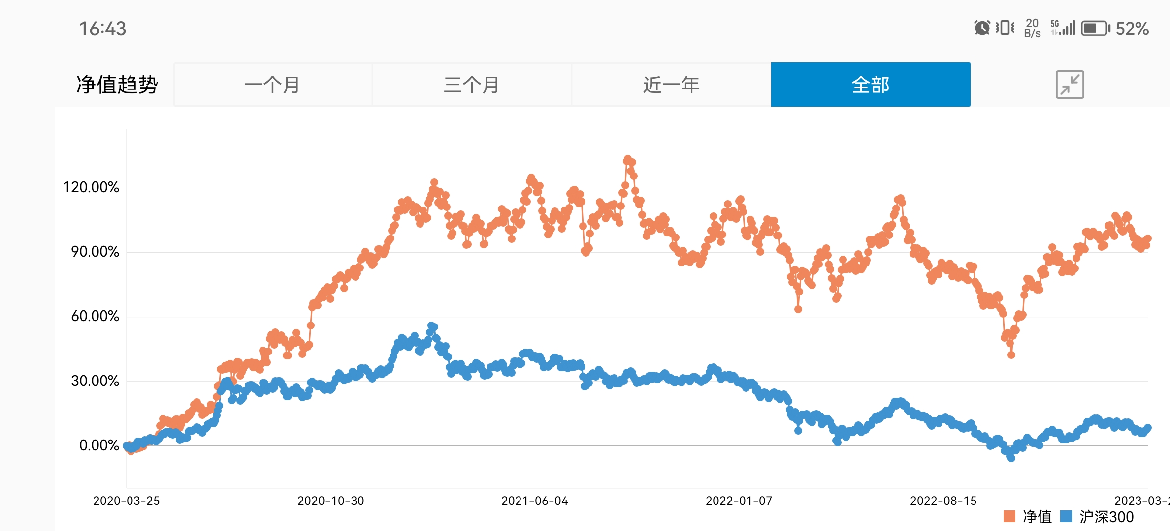 自己这三年实际年化会稍高一些,不过也差不多,毕竟三年也中不少新股,不过这段时间不太行了。 最高净值在2021年9月的,净值2.32,最低净值在2022年11月,净值1.52左右,满仓在A股回撤还是很大的。
