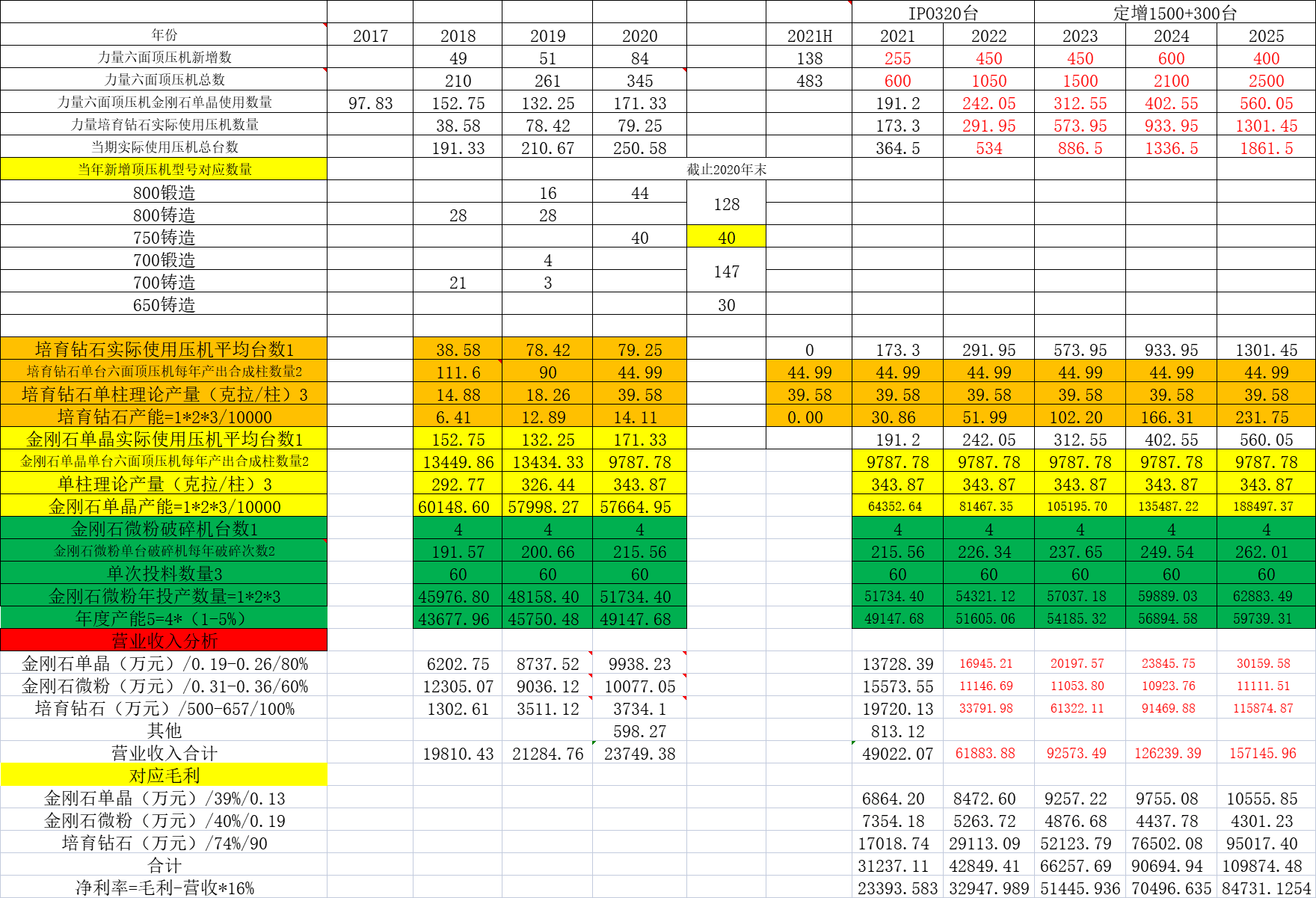力量钻石披露的数据显示2020年培育钻石单台六面顶压机每年产出合成柱数量为45*单柱理论产量39.58克拉/柱*2021年1-3月培育钻石销售均价657.08元/克拉=单台压机年度创造营收117万元,如果目前的培育钻石价格能够持续的话,基本2年可以赚回购买机器的费用了.