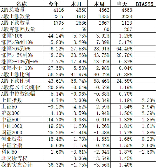 今天市场高开高走皆大欢喜,70%以上的股票上涨,各大指数均上涨1%以上,涨的非常均匀。可转债也是绝大部分都上涨,我的实盘昨天大跌的一半失地今天收复了,广汽到期只有32个交易日了,再要在20个交易日里有15个交易日股价满足强赎条件难上加难,乘今天涨的不错卖了后换了海印。没想到下午继续上涨,但昨天卖出的伟20转债,今天确实跌了1.11%,成为今天非常少数下跌可转债里的一员。