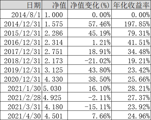 4月份收益+7.66%,今年净值1.037,累计净值4.501(从2014年8月1日净值1.0开始算)。