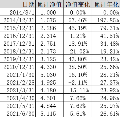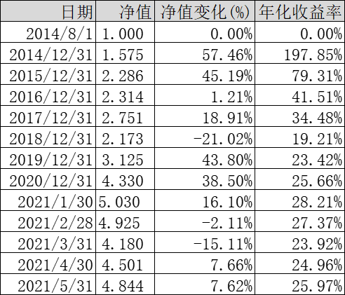 5月份收益+7.62%,今年净值1.117,累计净值4.844(从2014年8月1日净值1.0开始算),累计年化收益率约25.97%。