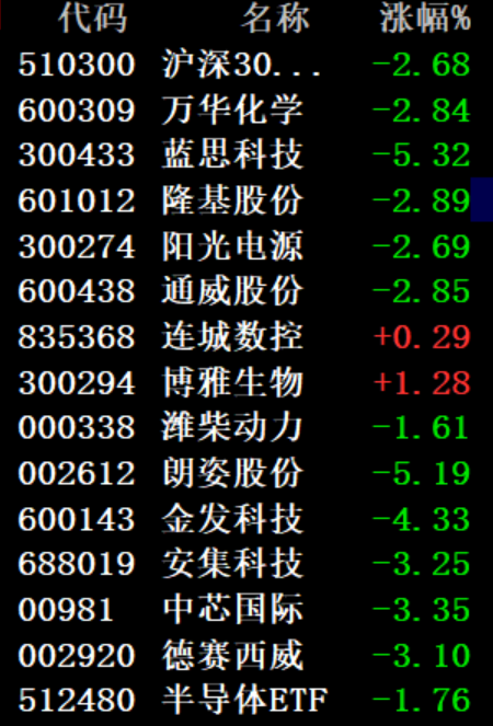今天沪深300跌回昨天的涨幅,万华-2.6%,蓝思-2.28%,安集科技继续跌-5.12%。