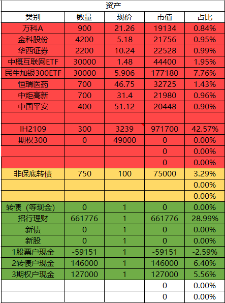 当下持仓状态:10万转债(凯发,金陵,英联,永鼎);20万股票(万科金地,平安,恒瑞,中概,鄂武商);300ETF+期权(名义市值100万),合计130万,仓位95%。