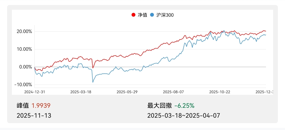 仓位62%,其中转债27%,基金35%,年收益20.23%。印象中经常跑赢沪深300,但年均收益不高,炒股方面悟性确实一般。今年账户基本上是躺平的一年,家中老人突发恶疾需要照顾,下半年也没多大心思看盘。人到中年真不容易,上有老下有小,我们这一代大多数有兄弟姐妹,对上一代还能以传统方式照应,有时候想想自己将来养老大概率要依靠人形机器人了。好在我也不善于频繁交易,基本上网格思路轮动转债,年底居然跟着大盘的步伐有两成收益。