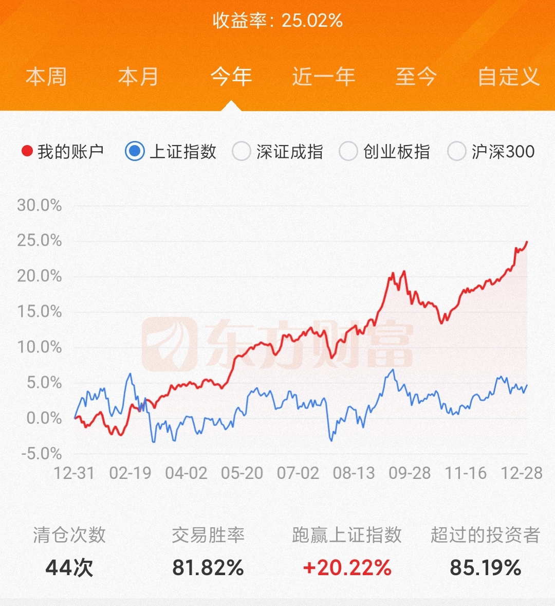 总共清仓44次,在东方财富APP上超过85.19%的股友。剩下的约15%的估计都在集思录吧。
