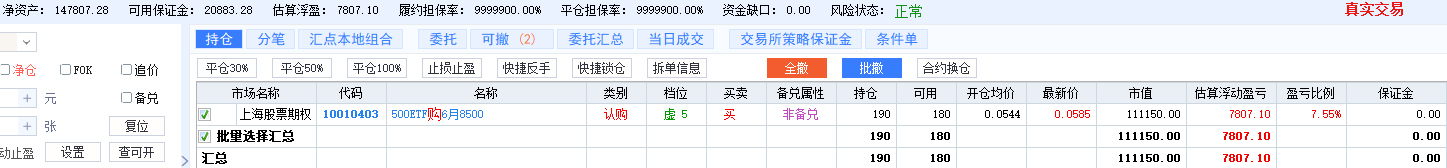 我的期权仓位计划是上涨10%我就丢6张,一直丢到100张为止,一旦虚值转实值,马上买入9月的虚值购,牛市不会持续很久的,今年的行情是这十年来最好做的一年!只要不是疯牛我依然看好.中国的资本市场与中国的大国地位严重不匹配.依然是处在低估阶段!