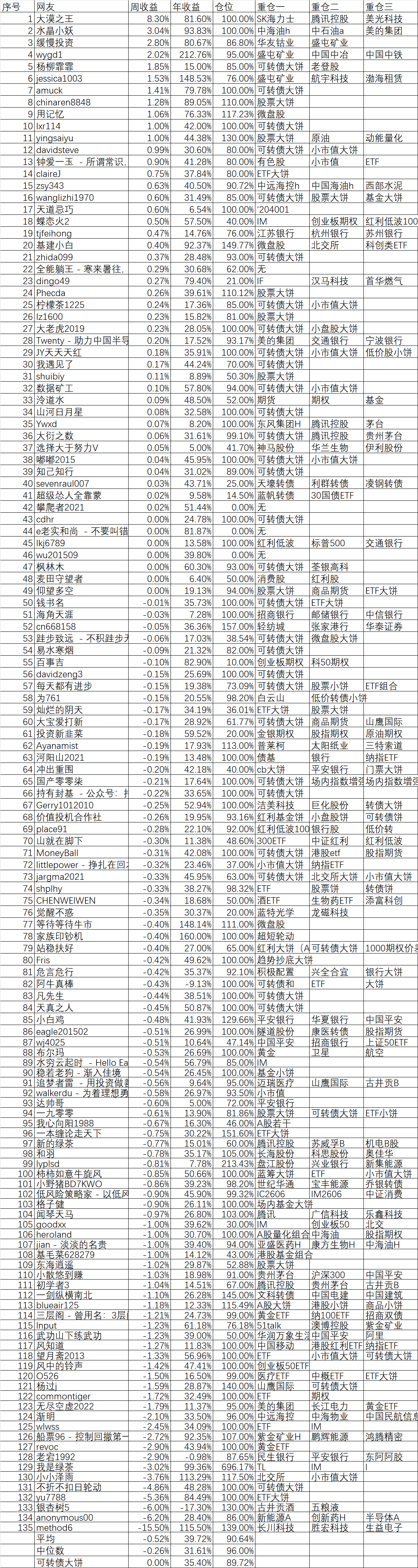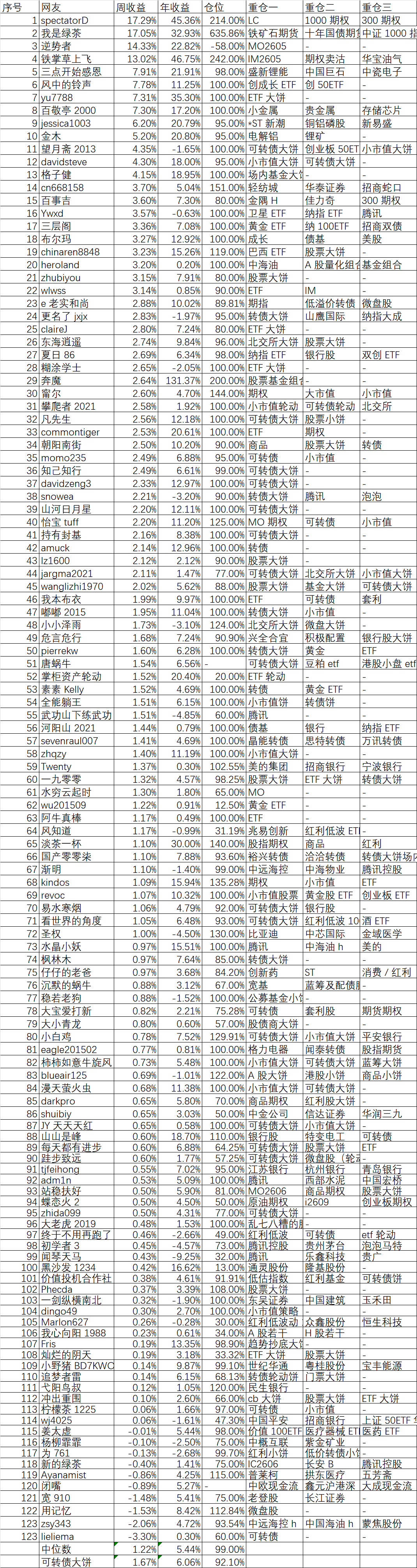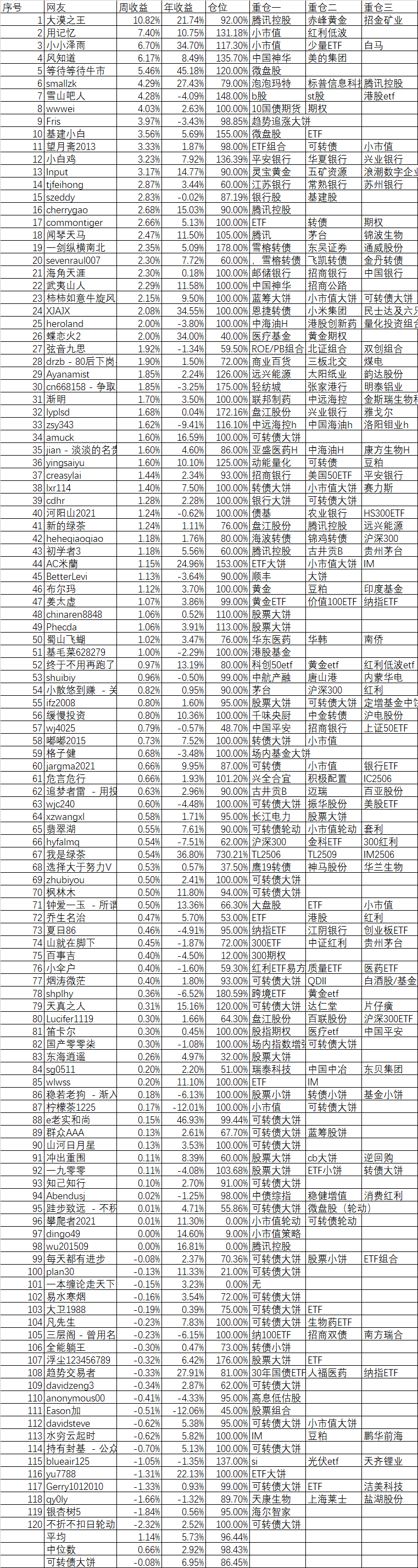 周收益 年收益 仓位 重仓一 重仓二 重仓三