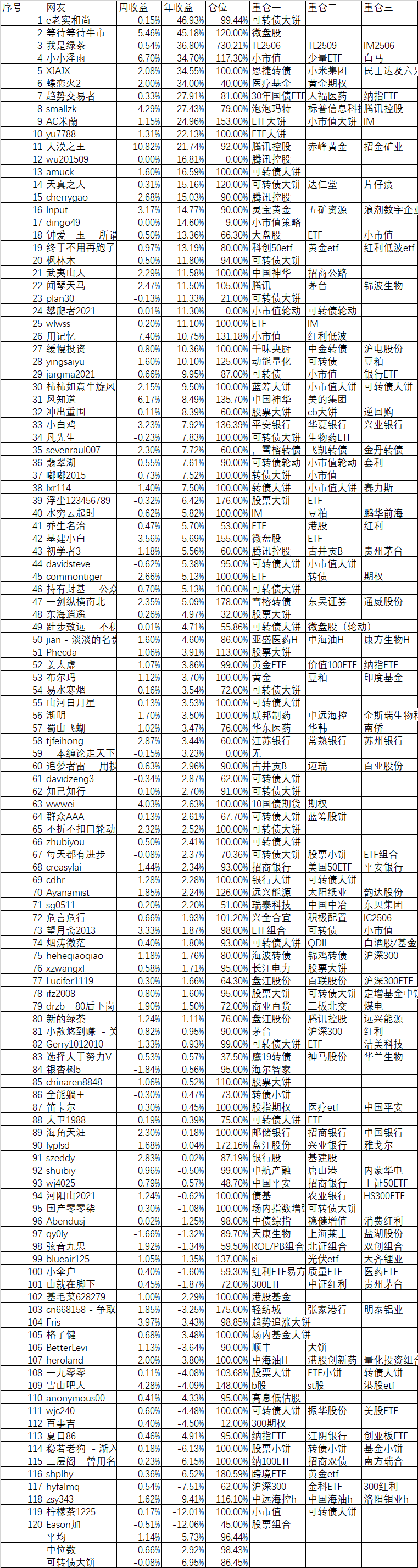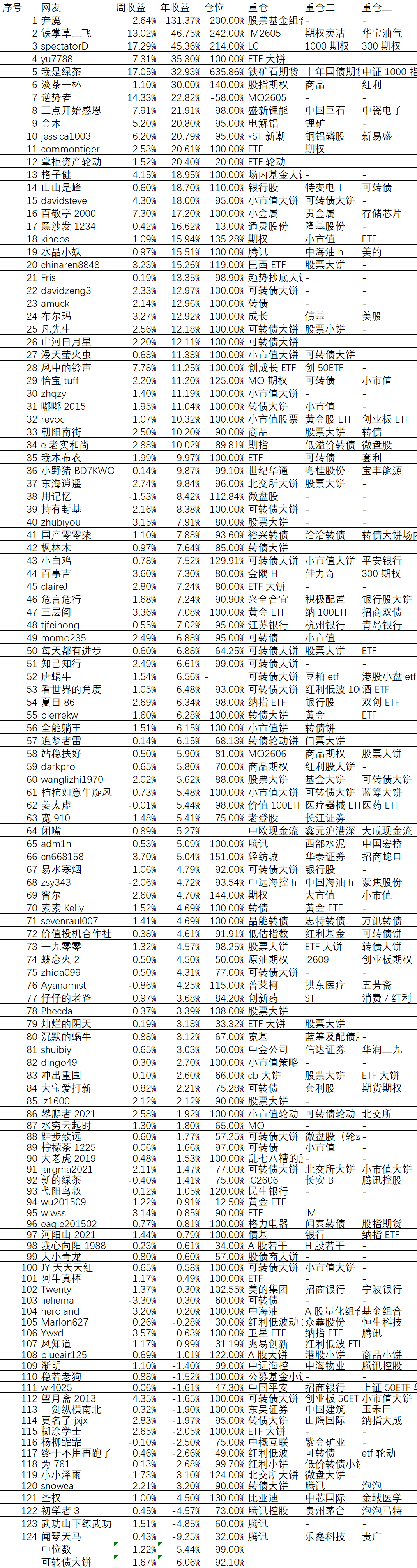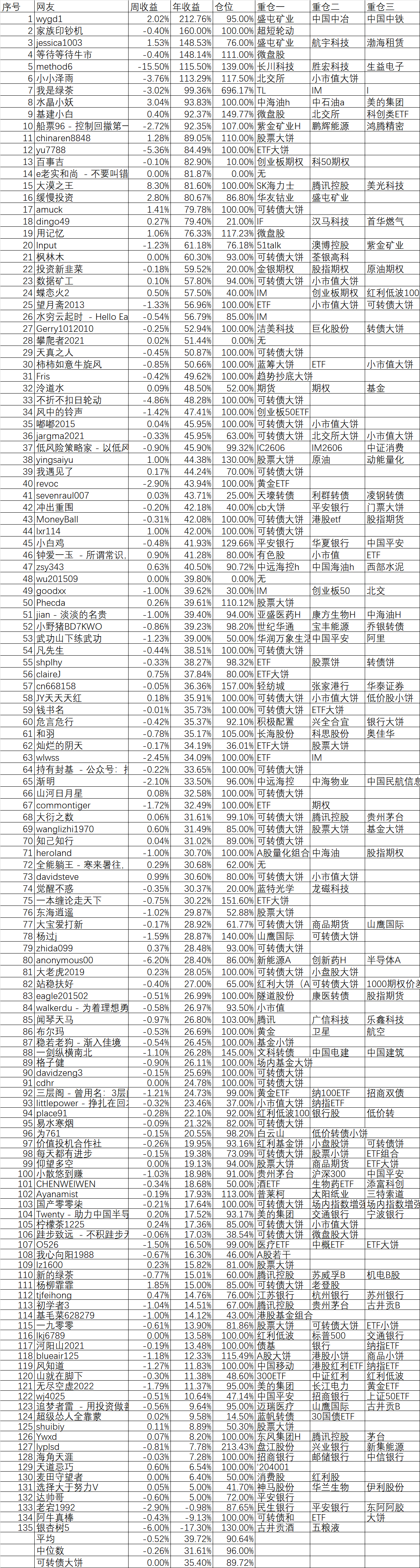 周收益 年收益 仓位 重仓一 重仓二 重仓三