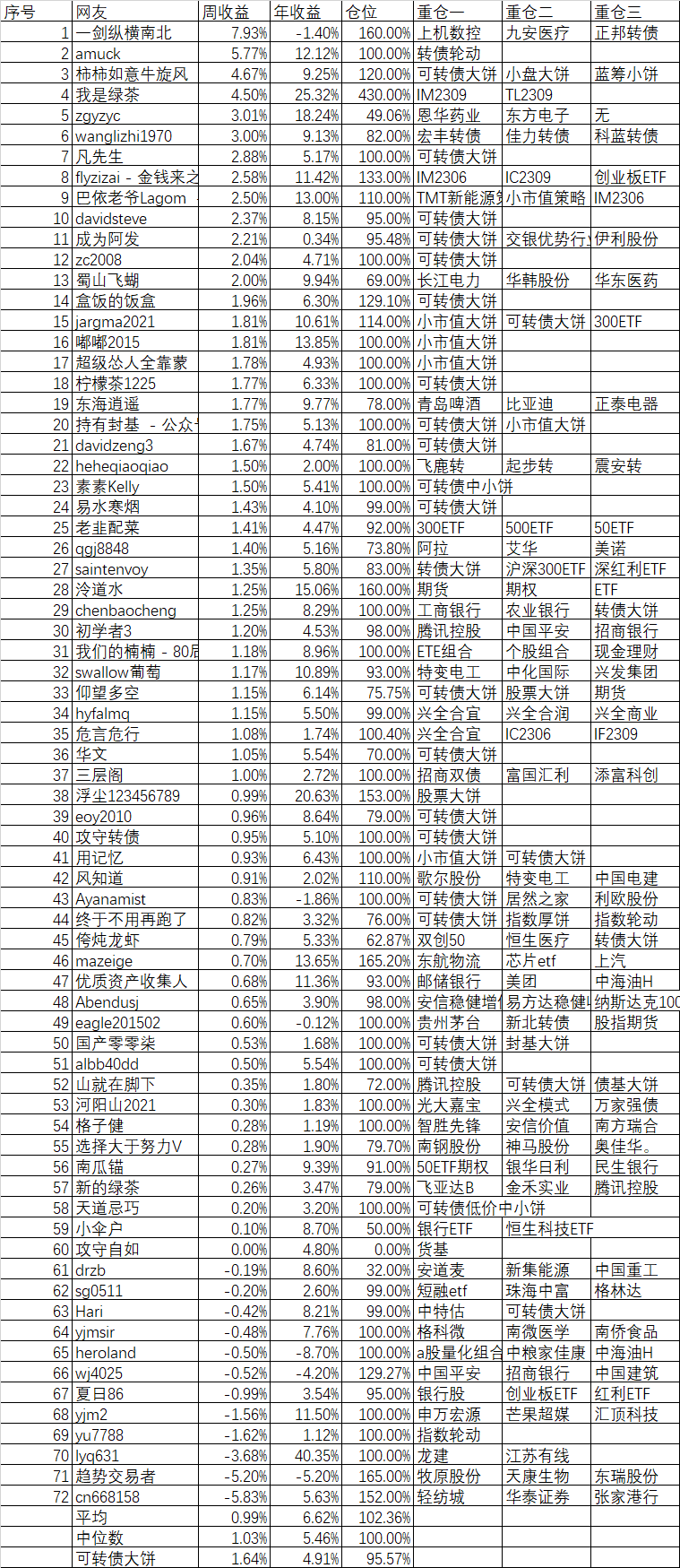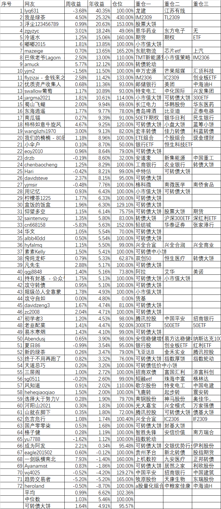 周收益 年收益 仓位 重仓一 重仓二 重仓三