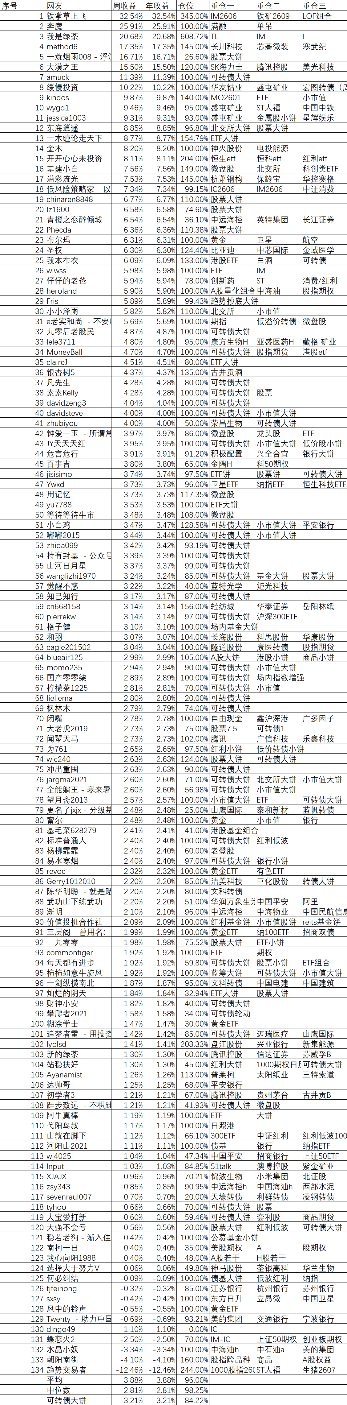 周收益 年收益 仓位 重仓一 重仓二 重仓三