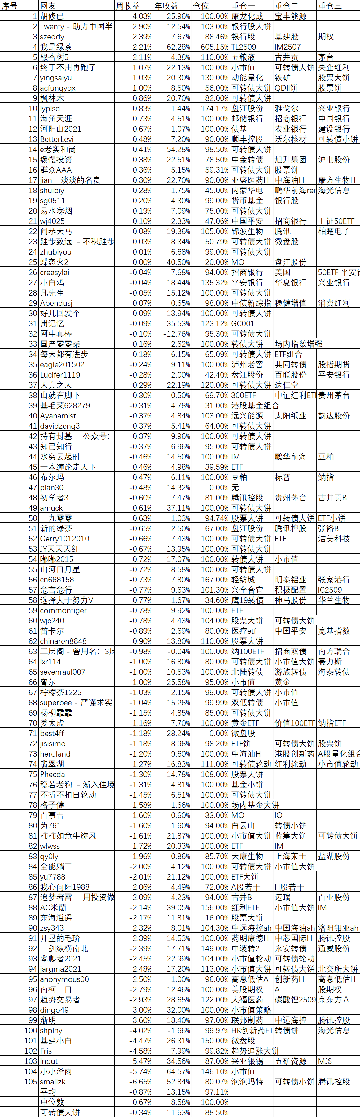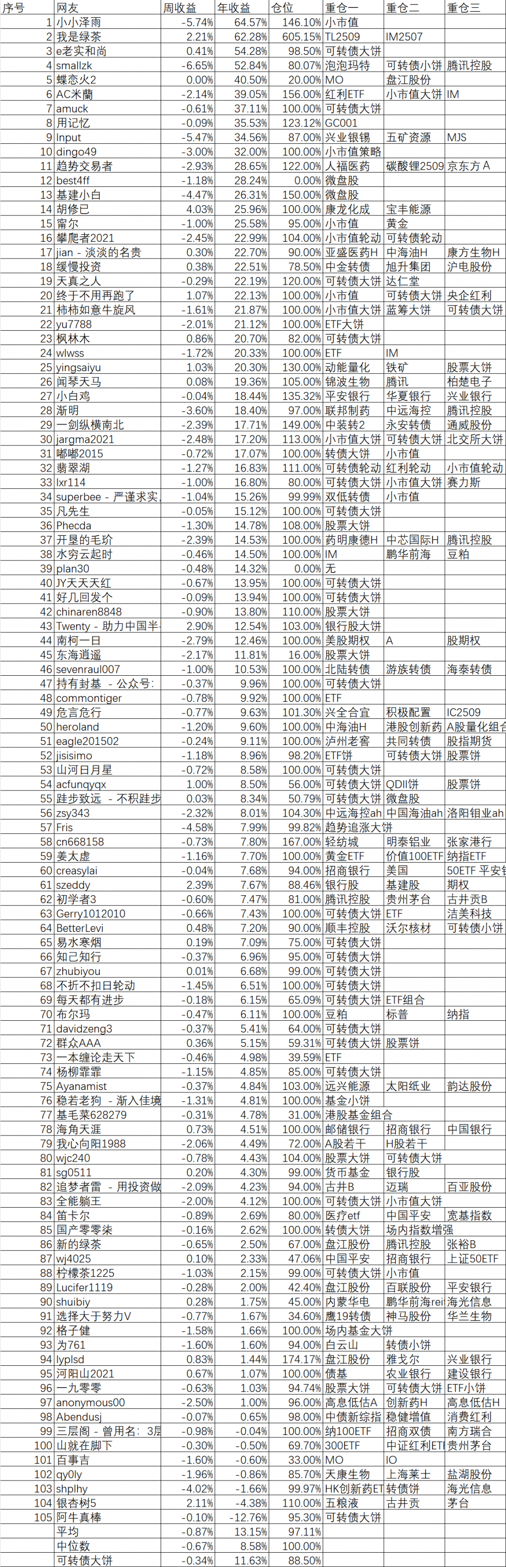 周收益 年收益 仓位 重仓一 重仓二 重仓三