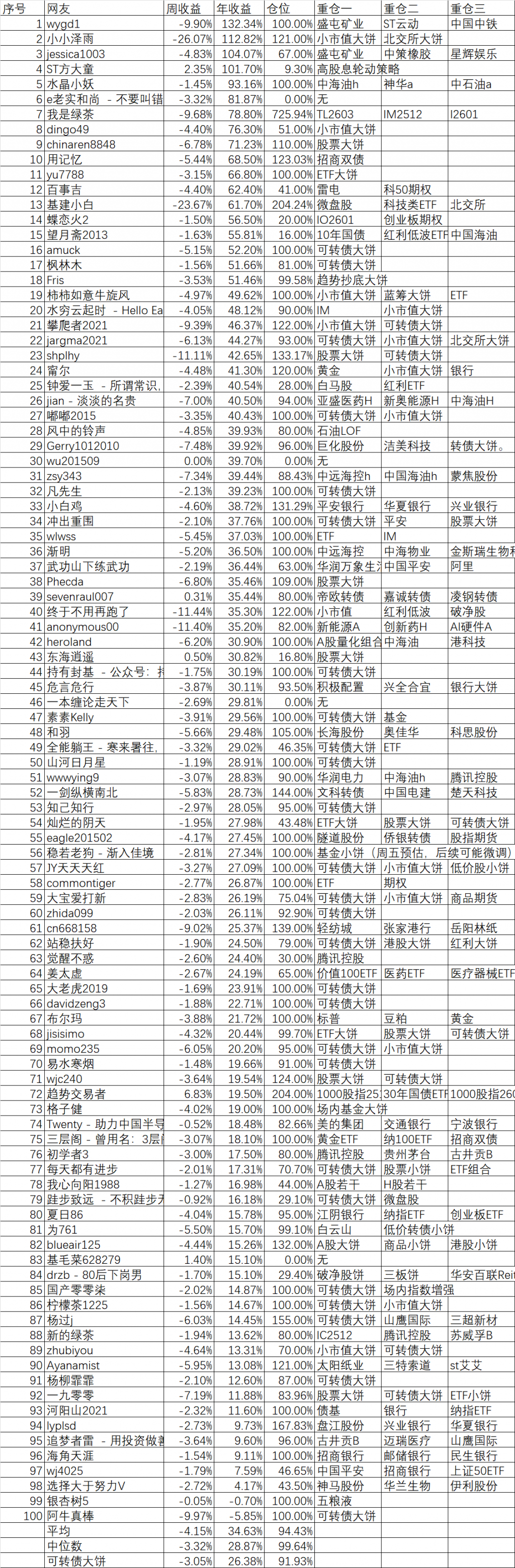 周收益 年收益 仓位 重仓一 重仓二 重仓三