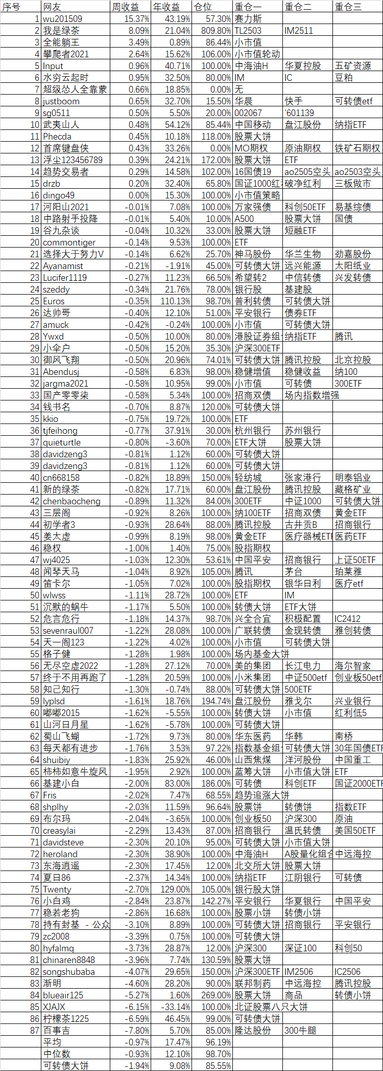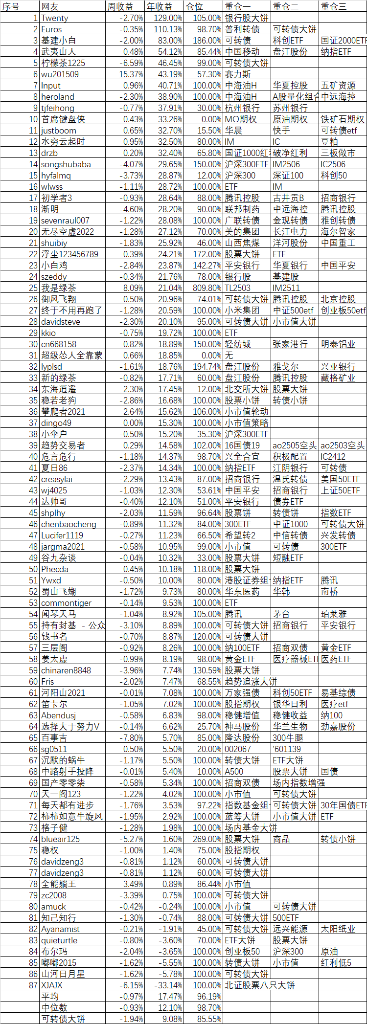 周收益 年收益 仓位 重仓一 重仓二 重仓三
