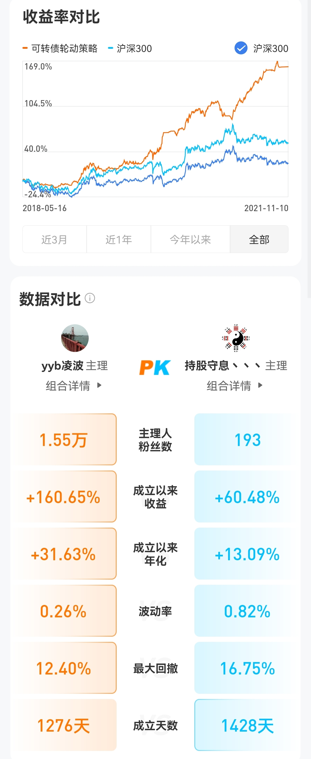 组合运行已1276天,截止昨天,显示日平均波动率只有0.26%,而同期沪深300ETF为0.82%,组合只有沪深300三分之一的波动。而年化收益则是31.62%对应13.09%。