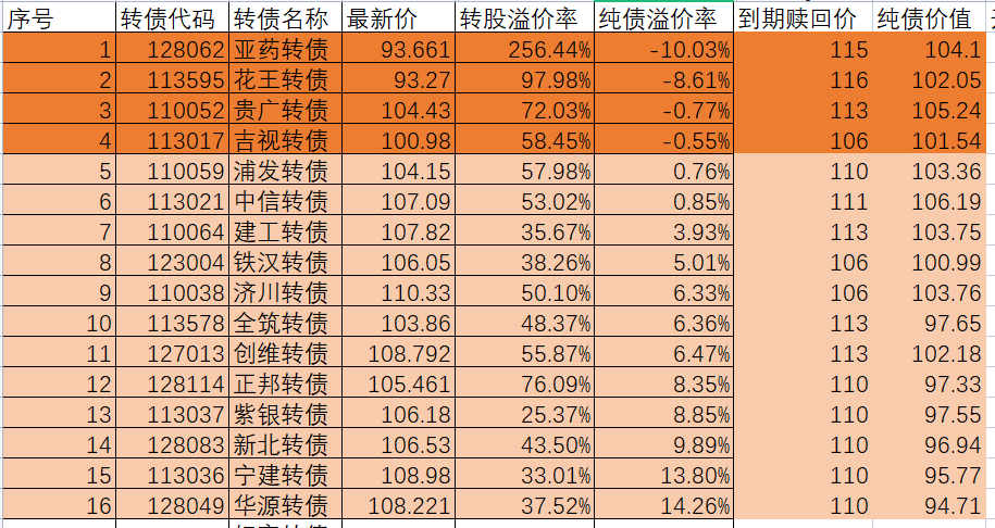 转债代码 转债名称 最新价 纯债溢价率