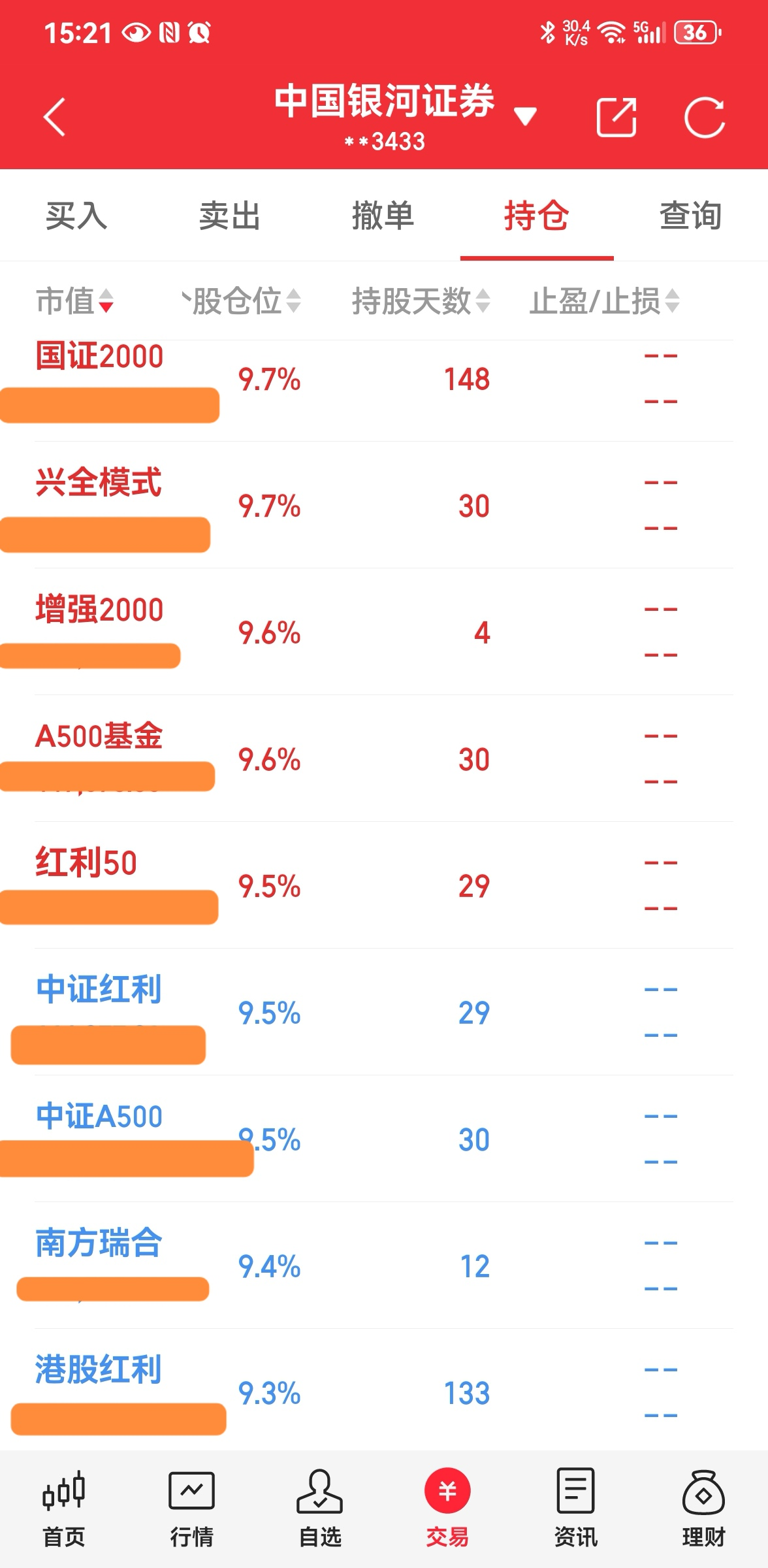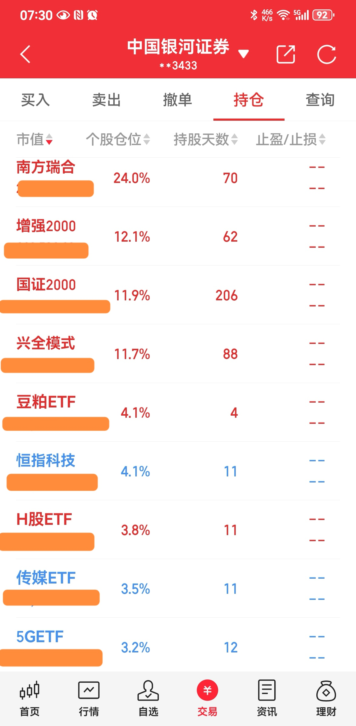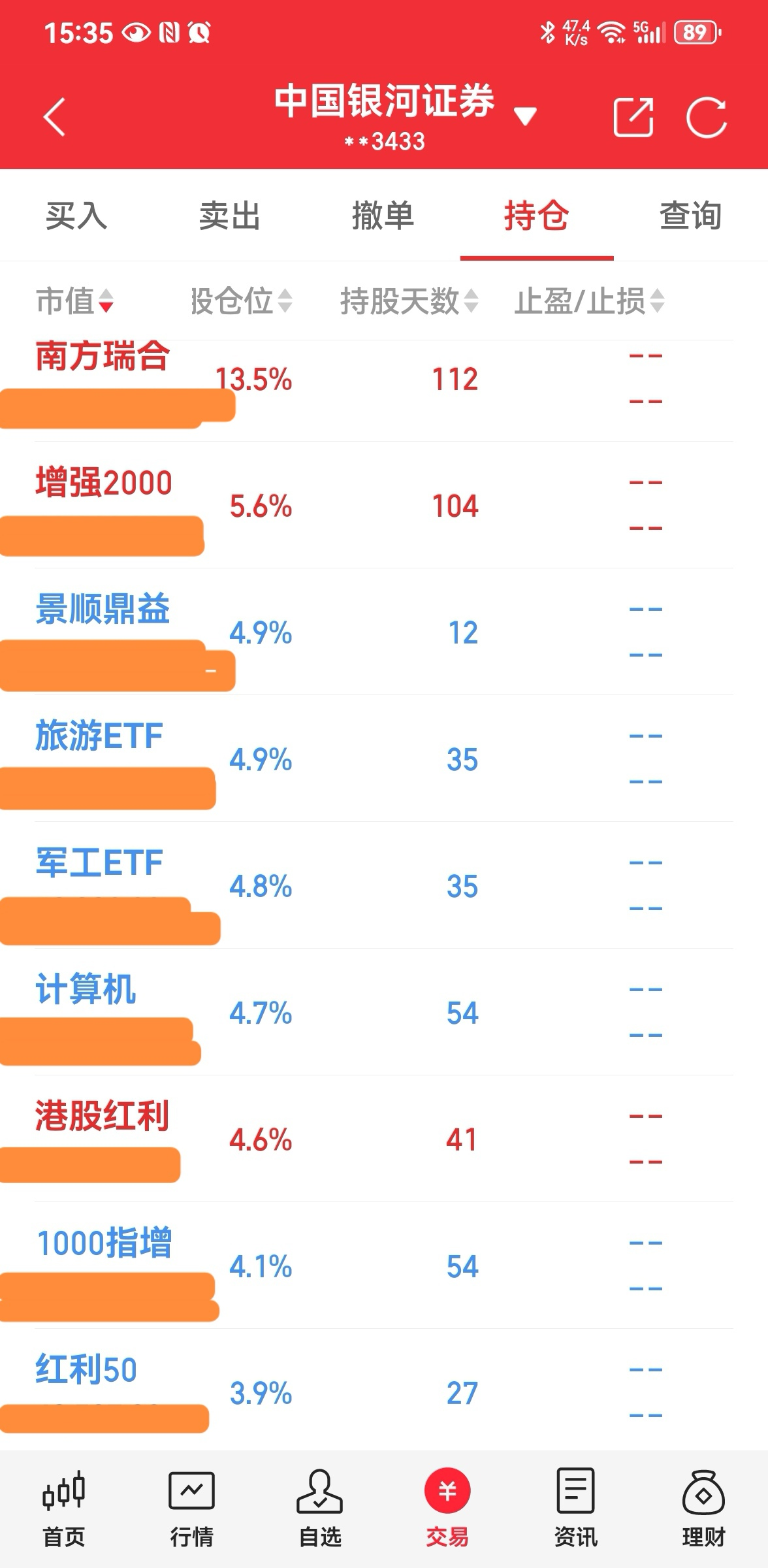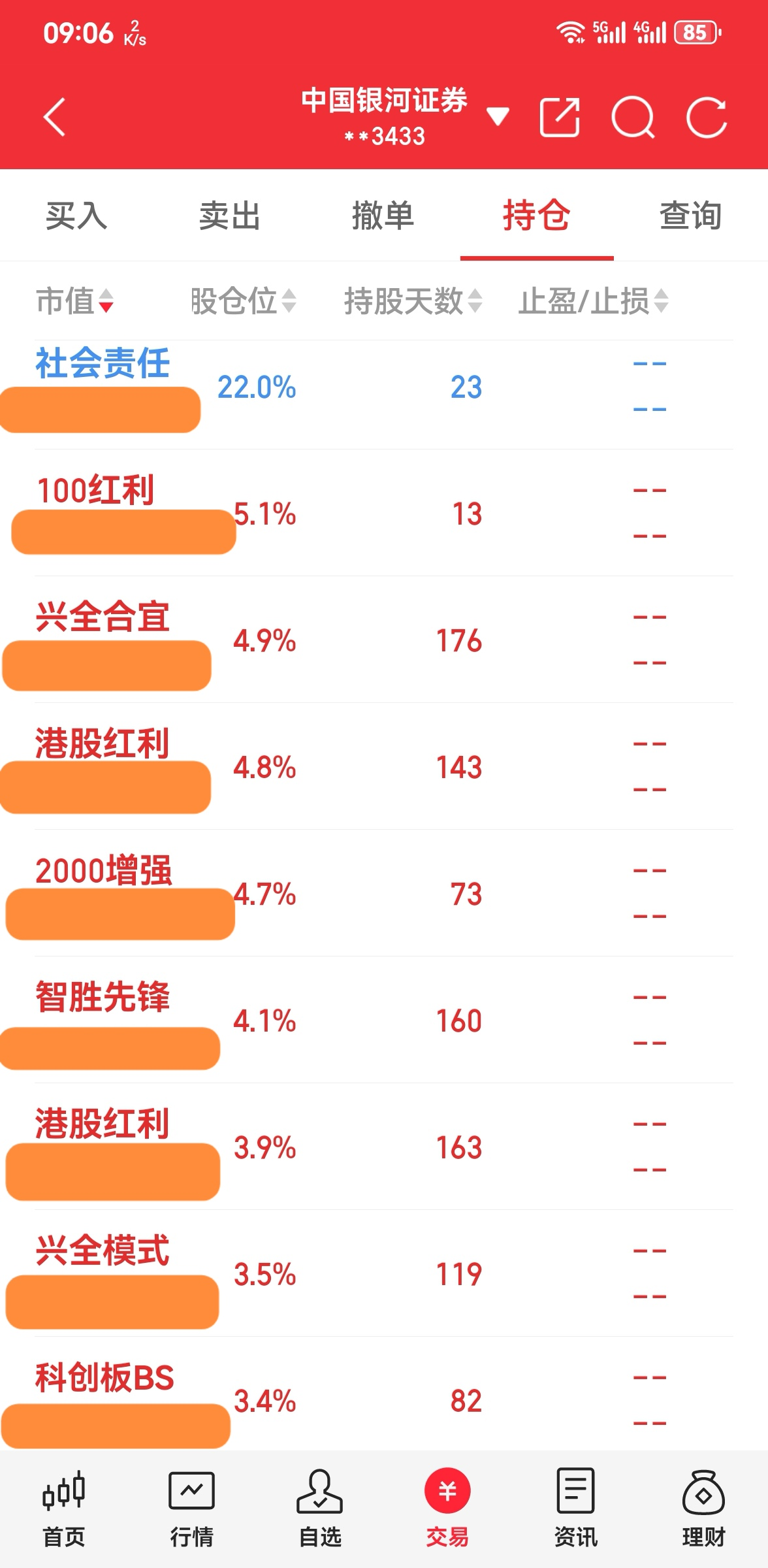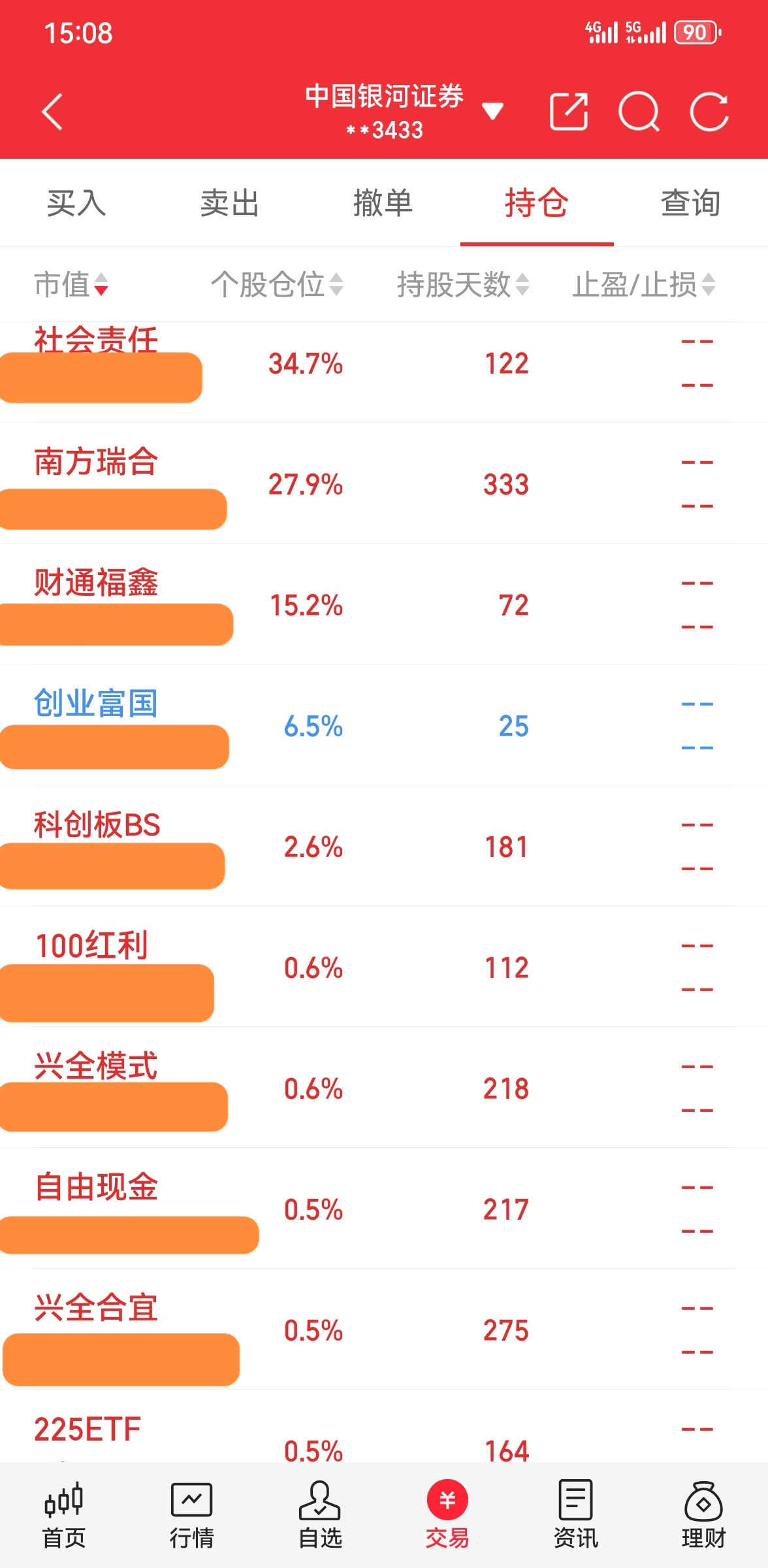 ----3、仓位:钱不过夜满仓君(因为有钱就心神不宁,以前追涨杀跌亏多赢少,所以现在天天满仓操作,这样既不患得患失,心态也更平和);