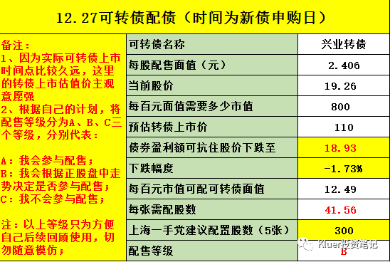 正股兴业银行。每百元含权12.49元,一般。转股溢价率32.45%,参考现在的银行转债,拍脑袋给个110的价格吧。总规模500亿,中签率会比较高,有希望人均一手。关于配债的话,感觉意义不大吧,不过因为我上海的门票股第一重仓是招行,如果有机会轮动过去一部分顺便参与配债倒是不错,看具体情况吧。