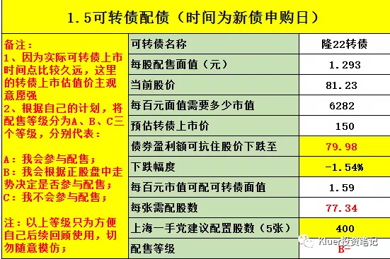 正股隆基股份主营业务光伏硅片,今年的赛道股,而且是龙头,相信大家都有所耳闻。每百元含权仅1.59,好像是我写配债以来见到的最低的了。上海一手党需配400股,鉴于正股是热门赛道龙头且之前的转债都是以高价结束,相信市场会给他一个绝对高的溢价来上市,拍脑袋给了150(说实话估150我觉得可能还保守了~),不过就算如此,安全垫也就仅有1.5%。如果单纯是为了配债没有什么必要参与了。我自己本身就持有隆基股份,且在90+的时候减仓了一半,所以明天会有三个选择,逢高卖出持仓、T回原有的仓位或者保持不动,仅现有仓位参与配债,具体看盘面走势,我觉得T回来概率不大,毕竟前面几天价格更低我也没有T回来,反正让我为了配债而买入我是不愿意的。