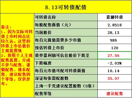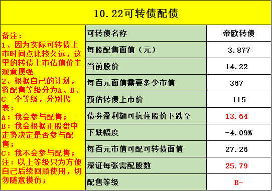 说一下我自己的打算的吧。从中长线看正股在这个价位买入的话也不算追高,估值也还可以,如果你本身就看好这个行业,那么买入配债其实挺合适的。但是短线上因为抢权行情快速拉升了股价,所以短期面临回调的压力会比较大,短线被套是很有可能的。而我自己没有长持家具板块的计划,参与就是奔着短线去的,因此对我来说配债的性价比已经不高了。如果明天股价没有很大的跌幅,我不打算参与,因此给了“B-”的评级。