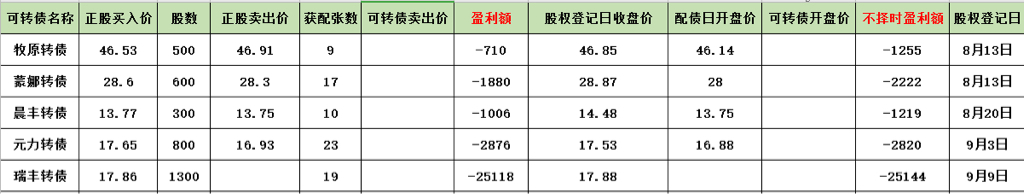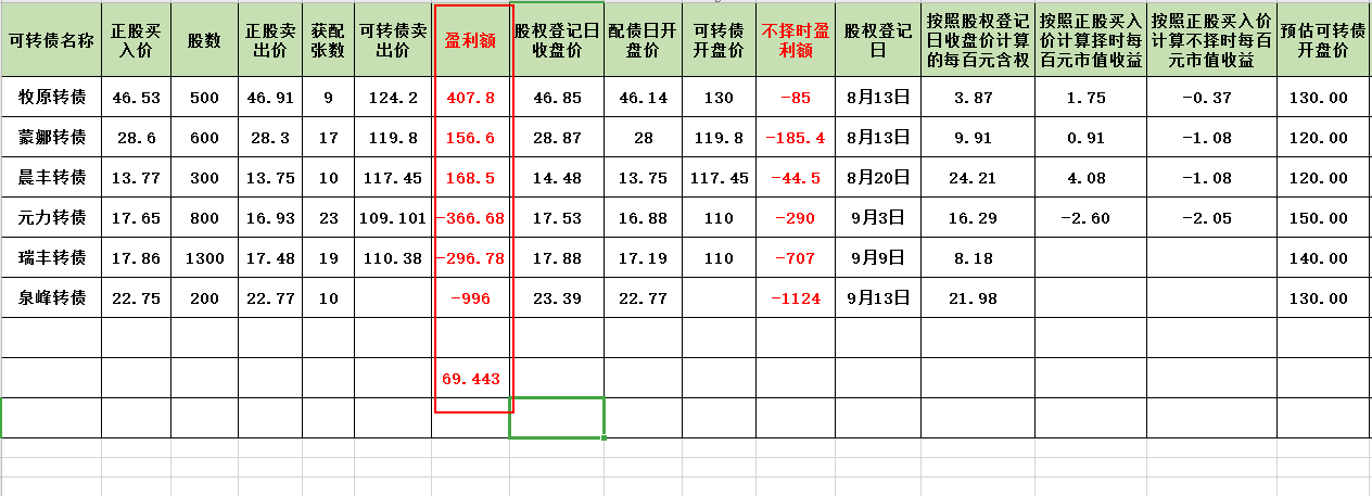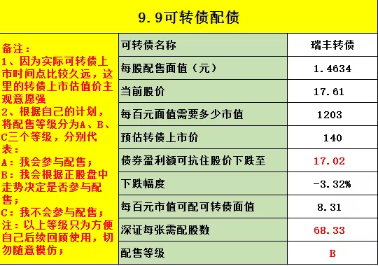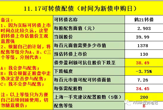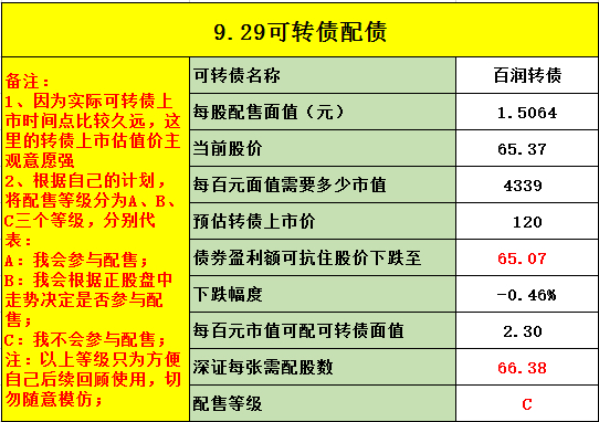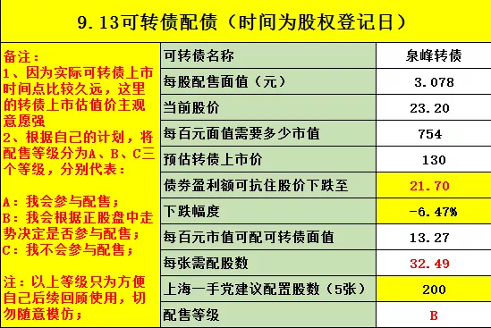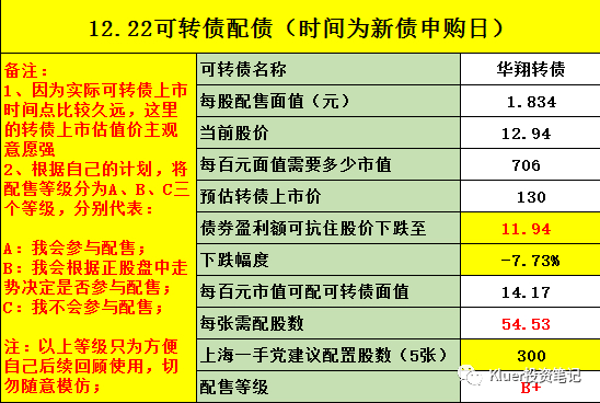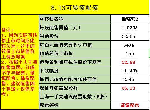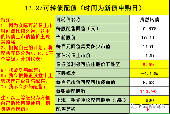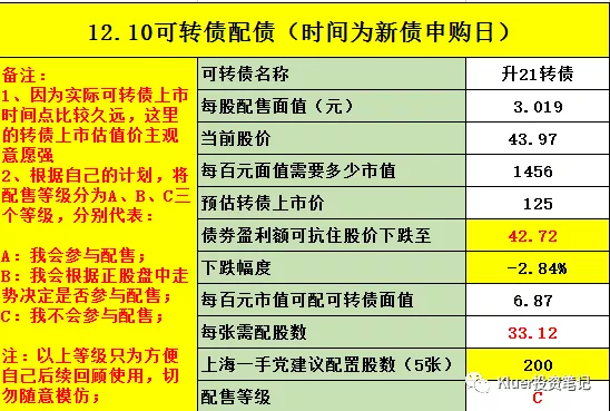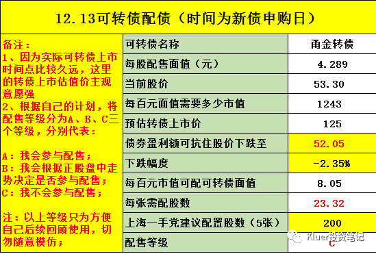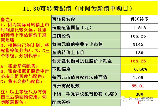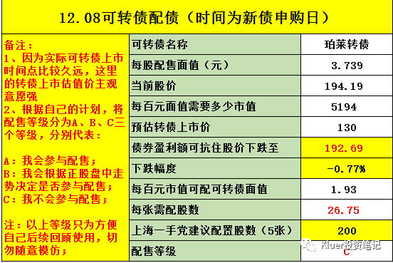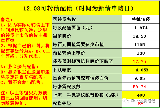 最后提示一下风险,可转债的行情已经不如1、2个月前火爆了,所以我们要放低配债的预期收益,进而在抢权的时候要更加谨慎。我最近参与的2个配债都是因为转债上市后价格大幅低于预期,导致整个配债是亏损的。