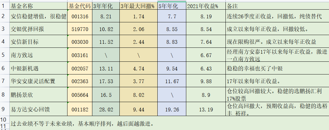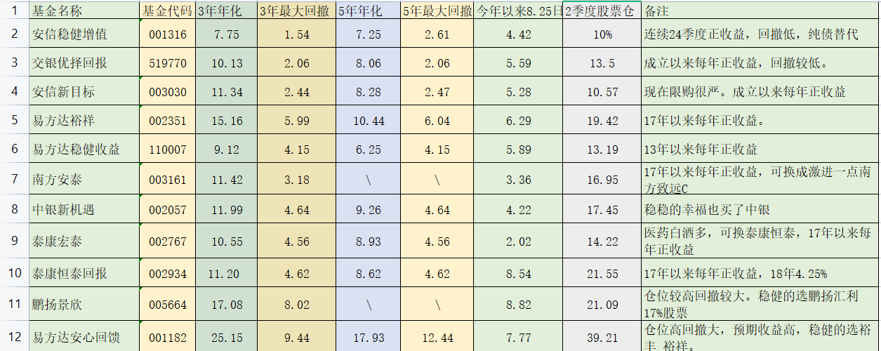 6,泰康,保险系比较稳健,泰康宏泰过往业绩还行,今年重仓的股票白酒医药家电不行,影响了业绩。泰康恒泰有C类,有C尽量买C,方便转换。
