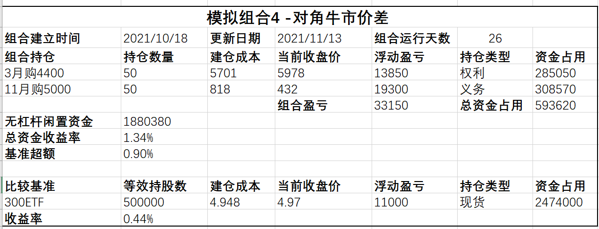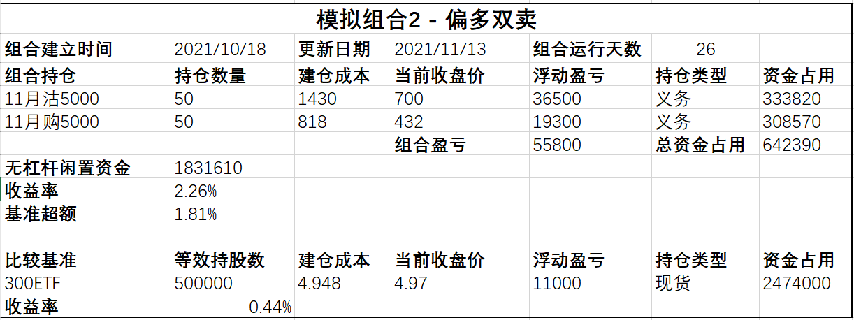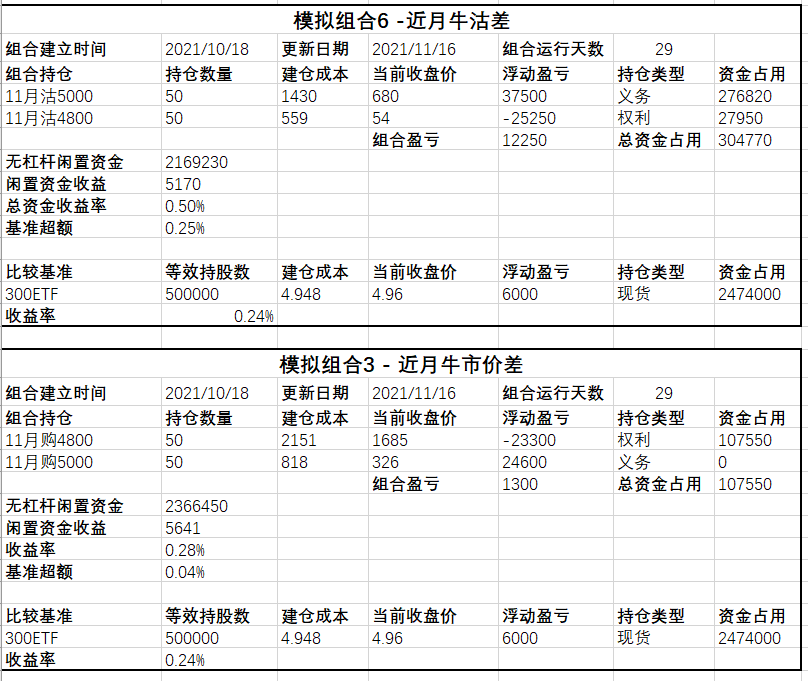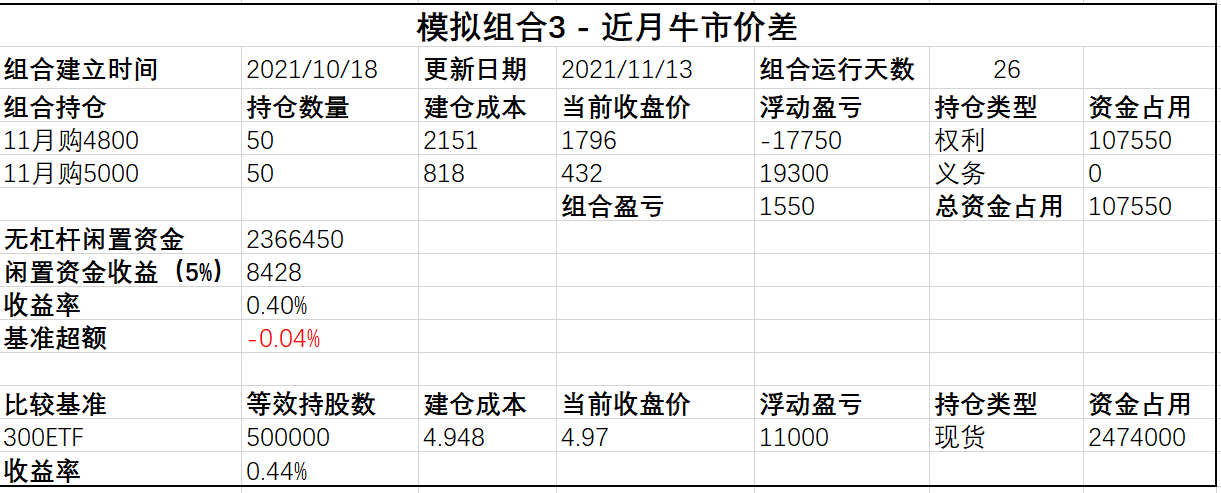 最后,如果近月认沽牛差(模拟盘是买入4800沽+卖出5000沽)也采用深虚值沽+浅实值沽的组合,则今天的收益率超过2.2%,并不输上述两个组合。