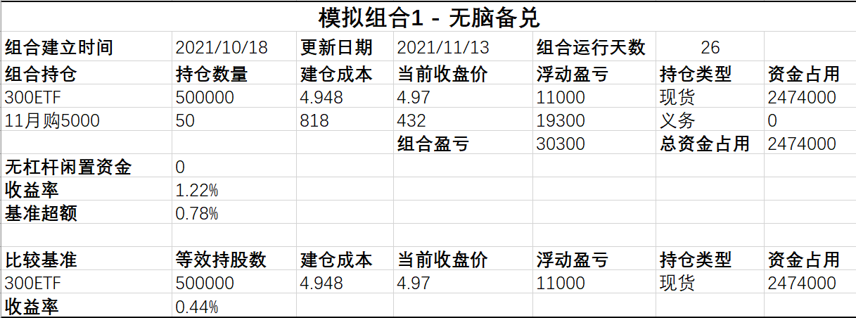 模拟盘方面,我改进了收益计算方法,闲置资金全部采取3%的年化收益计算,因为考虑在实战中,会保留一部分流动性好的现金用于追加保证金,而用不到的部分可以做5%左右收益的固收产品,综合算下来,我认为3%是一个偏保守的收益。