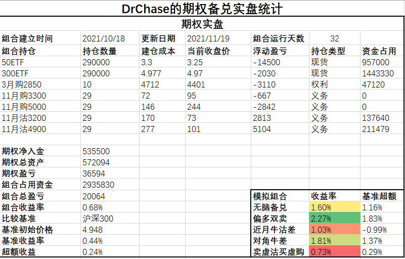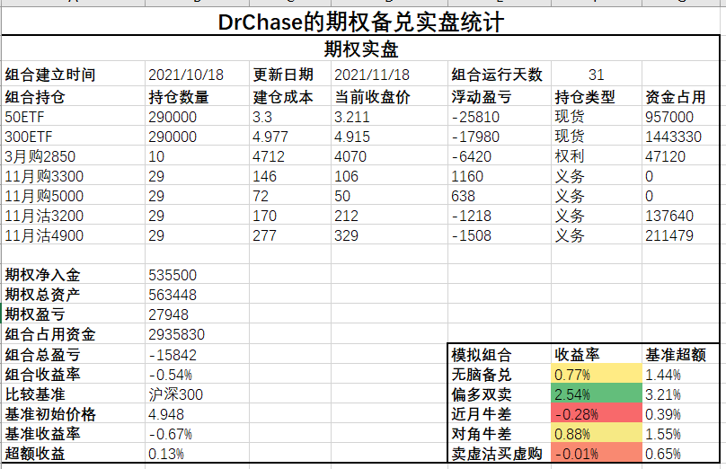 实盘方面,趁着今天的波动获利平仓了之前的实值卖购,又从新开了虚值,同时补足了卖虚沽的仓位,现在形成现货+虚值双卖的格局,也是符合最初的设计的。跑输了300几天后,今天终于又做出了超额。时刻提醒自己要保持初心,不要因为期权可以做T+0就沉迷做T,始终保持组合结构不变并且按照预先设计的方法应对各类行情才是长期盈利之道。
