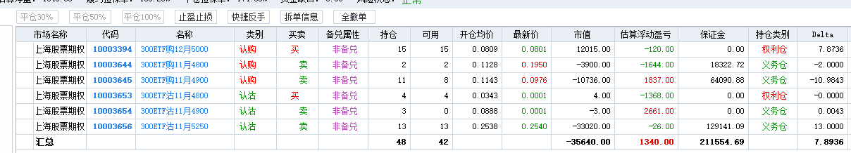 11月沽5000 = 680元,内在价值 = 400,时间价值 = 280元,内在价值挣了120元,时间价值挣了630元,合计盈利750元/张。而11月沽4800 = 54元,合计亏损505元/张。最后组合盈利 = 245元/组。