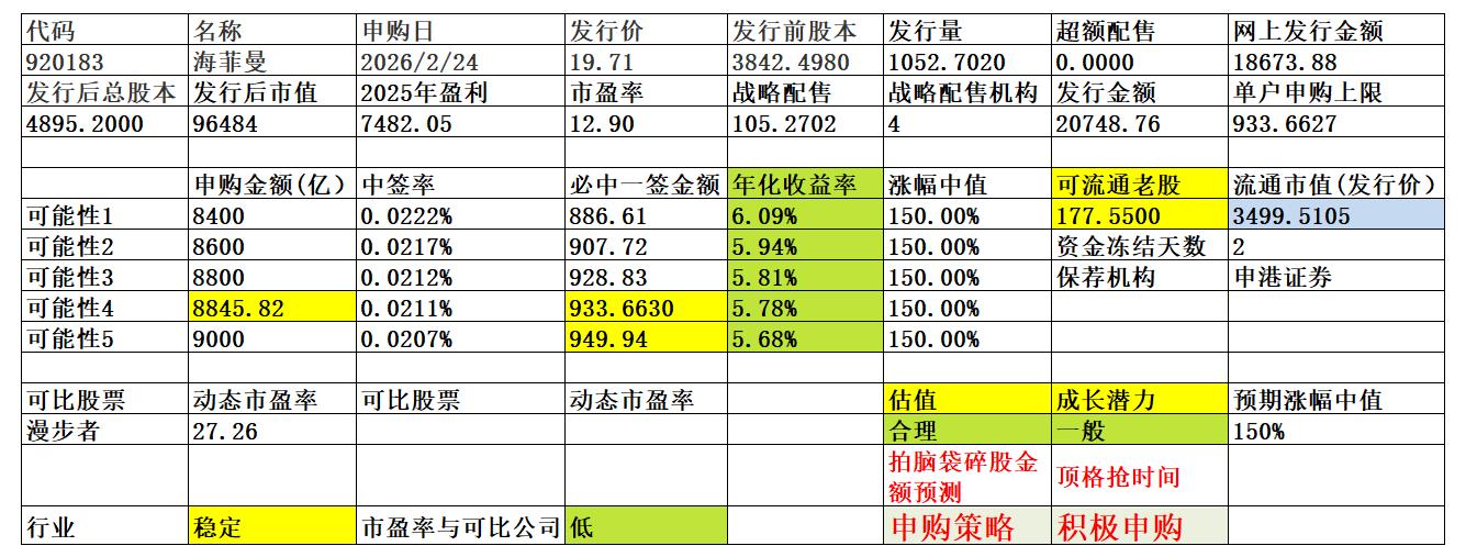 申购建议:公司所处行业较为稳定,公司质地尚可,发行动态市盈率较低,流通老股不多,申购资金超过8846亿元,则全员碎股,中签金额降低至500万左右;申购资金低于8845亿元,则顶格抢时间可获得1+1。
