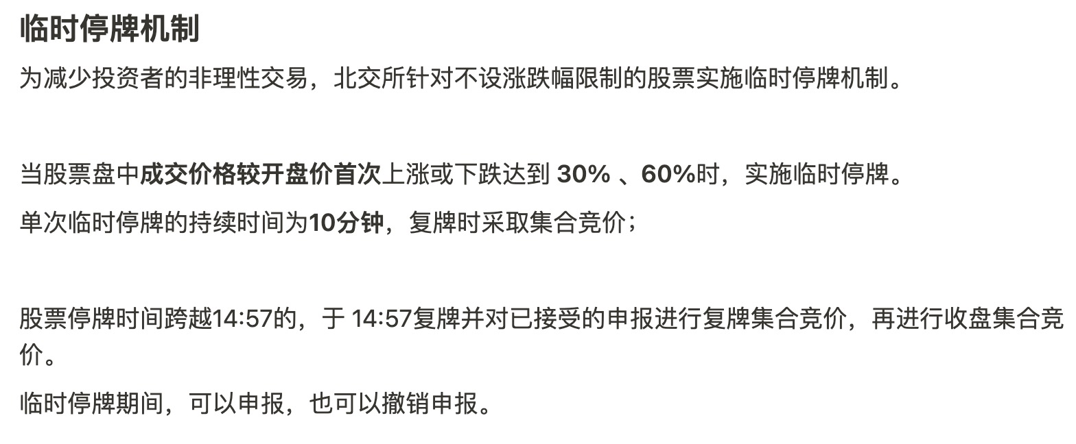 谁知道北交所铜冠停牌是几分钟?10 分钟,交易所自己看,同花顺什么的太慢了:https://www.bse.cn/products/neeq_listed_companies/related_announcement.html?companyCode=920019&typename=G