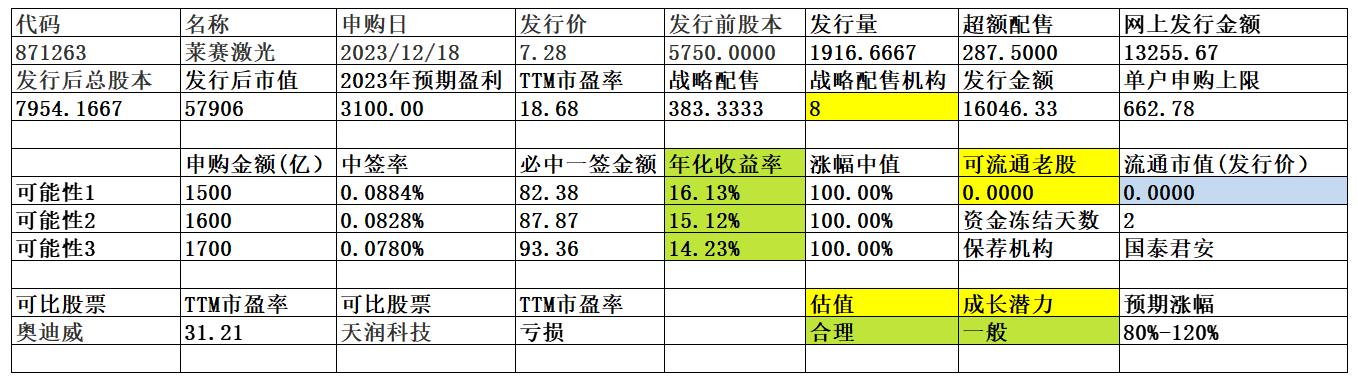 六、结论。公司所处行业竞争激烈,公司质地尚可,发行市盈率与可比公司相比有一定折让,无流通老股,发行后流通市值较小,总市值较低。可申购。(西磁科技1491.16亿元、派诺科技1326.39亿元、无锡晶海1333.81亿元、广厦环能1348.24,本次申购单户上限662.78万元,预计申购资金将稳步增长,请合理安排资金。)