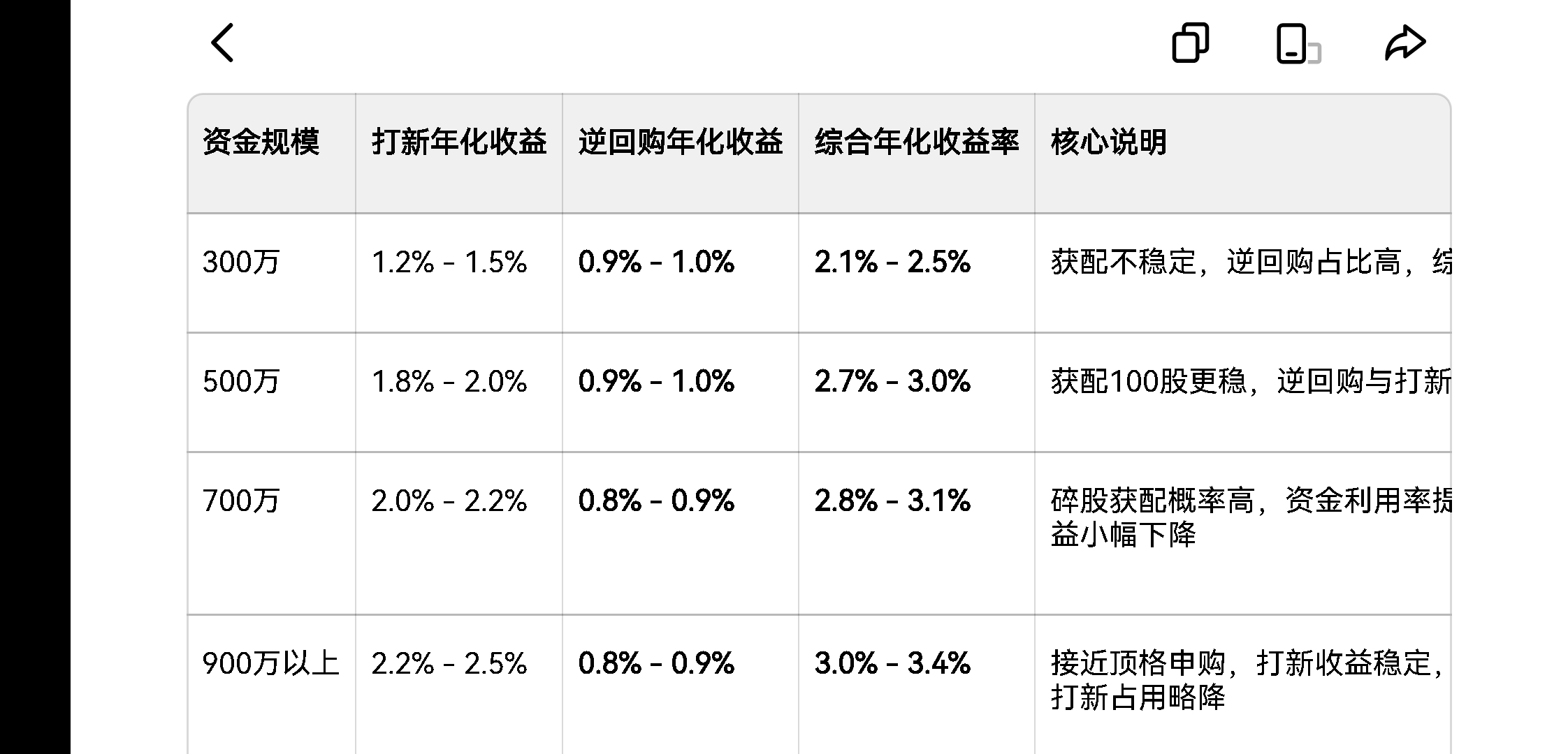 豆包给的说不同资金量是这个收益,逆回购按北交所打新后全年闲置资金剩余70%,有没有各级大佬来精确现身说一下。其实只有25个数据,完全可以把各档资金去对比一下,看看在不限账户的情况下可以中几手,还有卖出价格是怎么算的呢?按开盘价收盘价平均价还是中间价?差距大了。。总体感觉豆包给的有点低,提高0.5%吧~还有逆回购也低了,25家新股没有周四发行的,周三四次,还有四月末周一发的实际占了6天,一共占62天吧?不到全年的20%,根据今年204001这行情,完全可以做到1.4%-1.5%,实际上剩余300天逆回购年化可以接近1.2%的,另外还有十月前的RITEs呢,也可以达到0.3%,所以整好了总收益率可以到4.5%的。。但是,有几个人总能整好的呢?全年一次都没翻车的有吗?大鹏有几个人卖到了100多?所以,这个总收益率在一定范围内都是可以接收到,俺总体的感觉是:3.5%不及格--4.0%及格--4.5%良好--5.0%优秀--再高?那是神!!