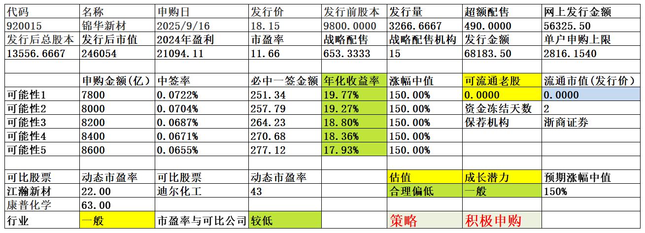 锦华新材发行价18.15元,饕鬄海预测上市定价30-35元。折合每100股只有1200-1700元的收益感觉很鸡肋啊。和三协电机的单签收益7000-8000元收益差数倍,感觉锦华新材真鸡肋啊!要是2+1的收益率连千1都没有的话 哎 那真是鸡肋 顶格更难受