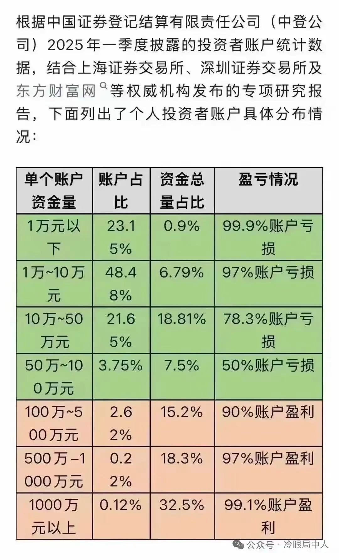 A股账户呈现明显的金字塔结构,约98%的账户市值低于50万元,而超过500万元的账户通常被归为“牛散”或大户,体现出极强的头部集中性。