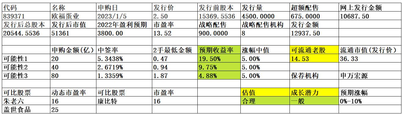 六、结论。公司所处蛋制品行业,行业波动性较大,公司质地尚可,2022年业绩增长,动态市盈率较低。发行价2.5元为北交所最低,实控人为外国股东,流通老股较少,可申购。(鉴于近期北交所生态问题,前几只申购资金不足10亿,又回到了精选层打新的状态。申购风险较大,建议仅供参考,盈亏自负)