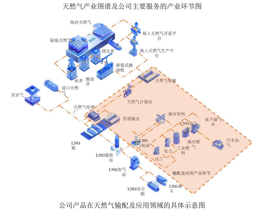 公司主营业务为天然气输配及应用装备的研发、生产和销售。公司依托于技术实力雄厚、行业经验丰富、产品类别多样等优势,为天然气领域不同应用场景内客户提 供天然气调压、计量等专用装备及综合性解决方案。